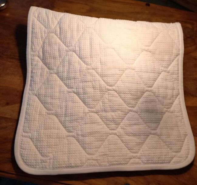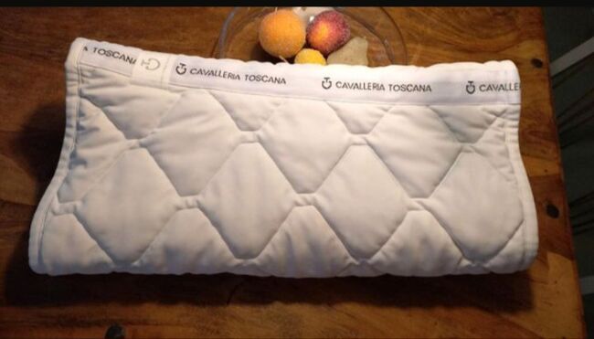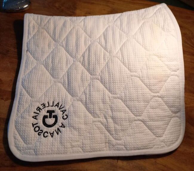 White dressage saddle pad from the Cavalleria Toscana brand in very good, well-kept, used condition. Has embroidered logo on the left side. Very good sweat absorption.