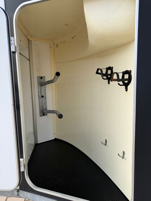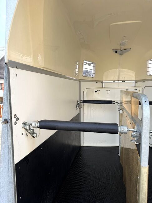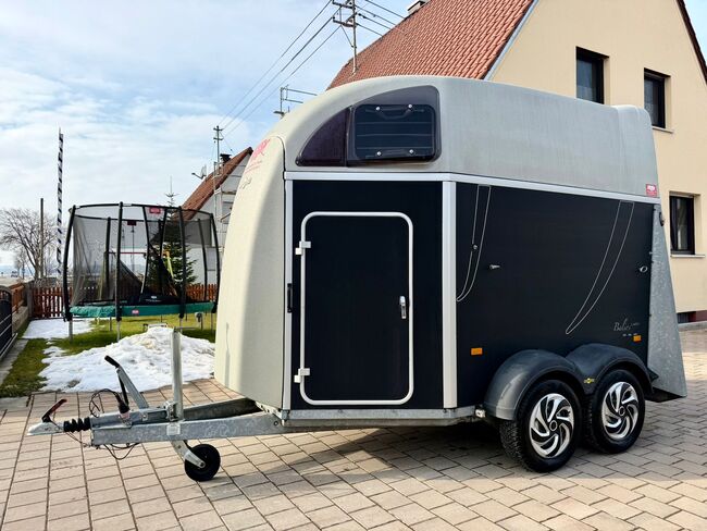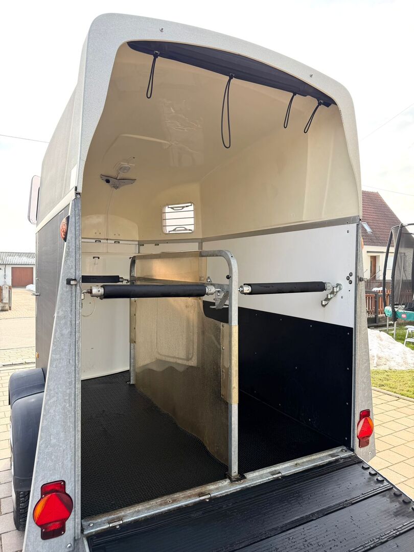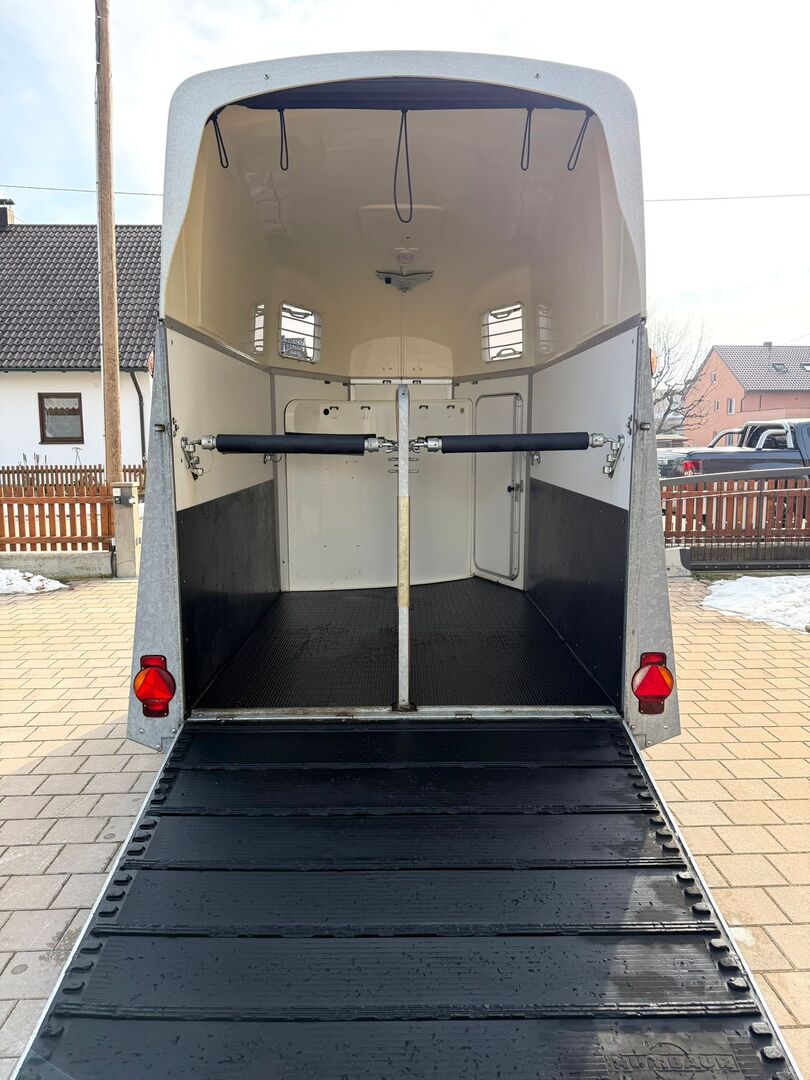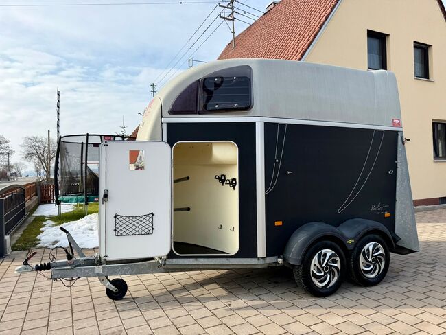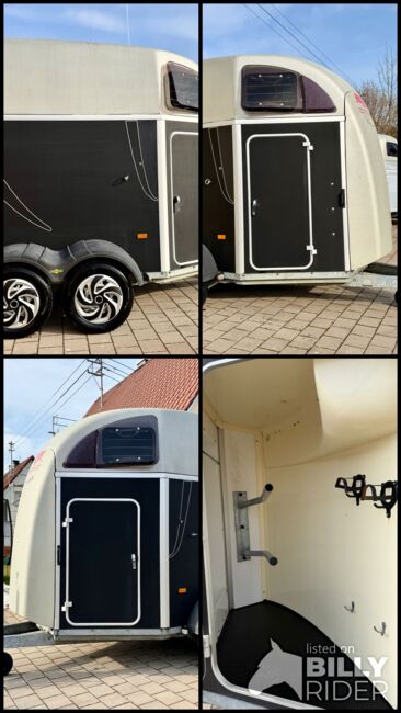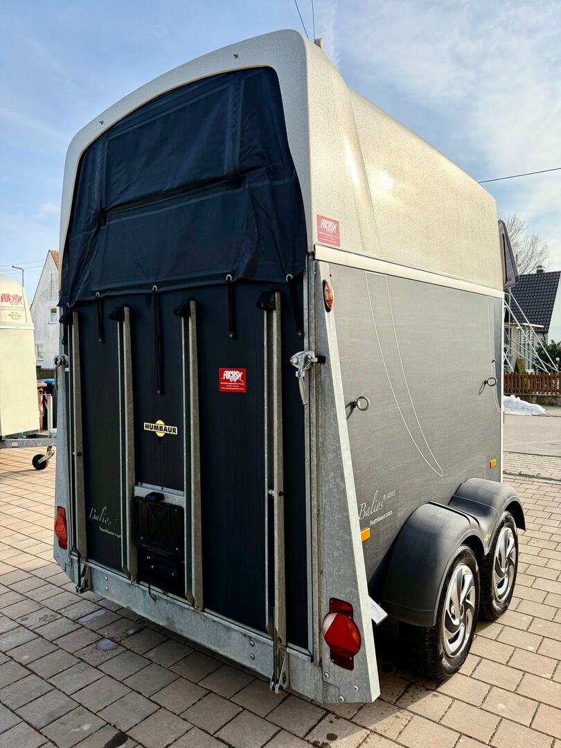 ❗️Humbaur Balios Aero Saka horse trailer Horse trailer - - First registration 07/2013 - Unladen weight 804 kg - Permissible total weight 2400 kg - Max. drawbar load 100 kg - HU until August 2027 - Chassis with shock absorbers for 100 km/h approval - Tires from 2033 - Automatic jockey wheel - Opening tinted windows - Panic system - loading aid - Net roller blind - Side stop on the loading ramp - Wooden floor - Rubber floor glued and sealed - Hay net holder - Interior lighting - Camera with monitor - Holders for feed and water buckets - PVC partition wall completely removable with adjustable swivel bar - Pony equalizer - step protection - Padded breast and rear bars - tack room