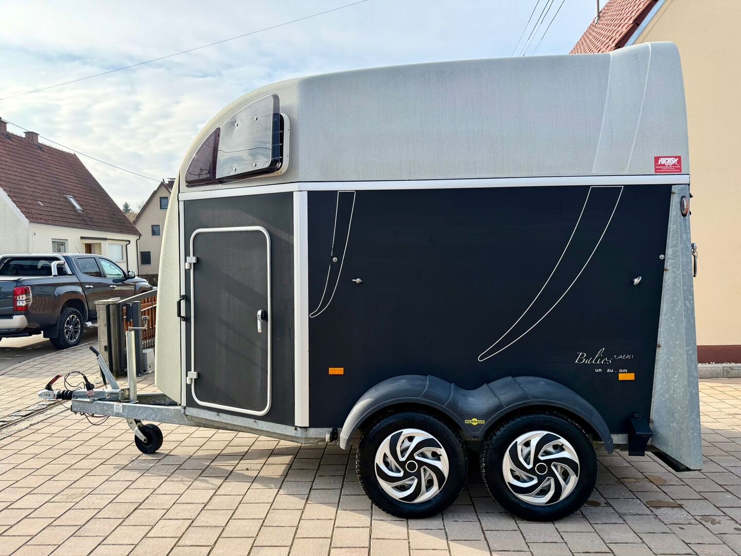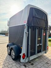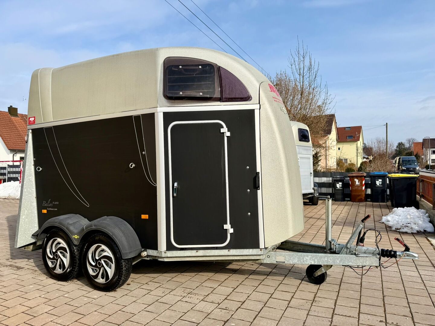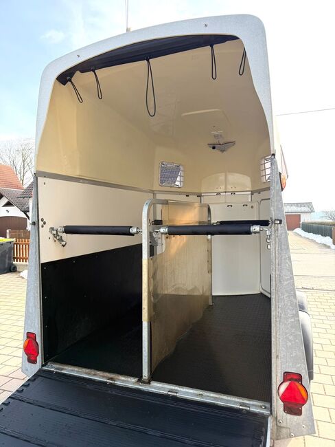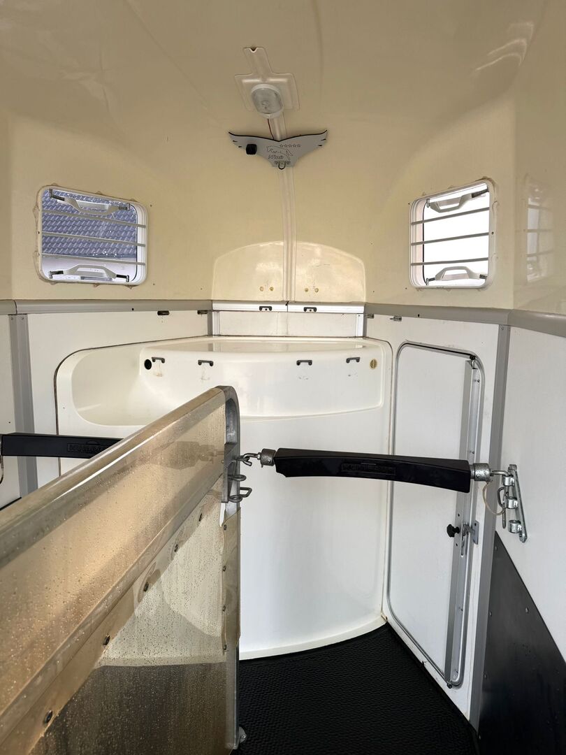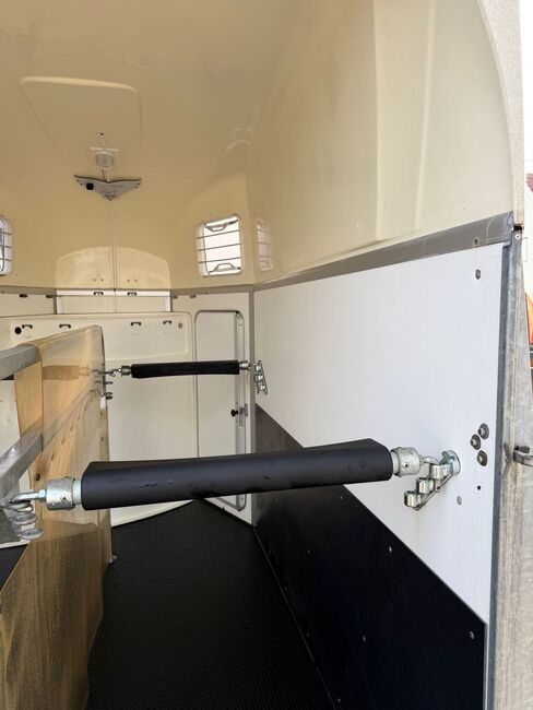 ❗️Humbaur Balios Aero Saka horse trailer Horse trailer - - First registration 07/2013 - Unladen weight 804 kg - Permissible total weight 2400 kg - Max. drawbar load 100 kg - HU until August 2027 - Chassis with shock absorbers for 100 km/h approval - Tires from 2033 - Automatic jockey wheel - Opening tinted windows - Panic system - loading aid - Net roller blind - Side stop on the loading ramp - Wooden floor - Rubber floor glued and sealed - Hay net holder - Interior lighting - Camera with monitor - Holders for feed and water buckets - PVC partition wall completely removable with adjustable swivel bar - Pony equalizer - step protection - Padded breast and rear bars - tack room