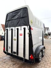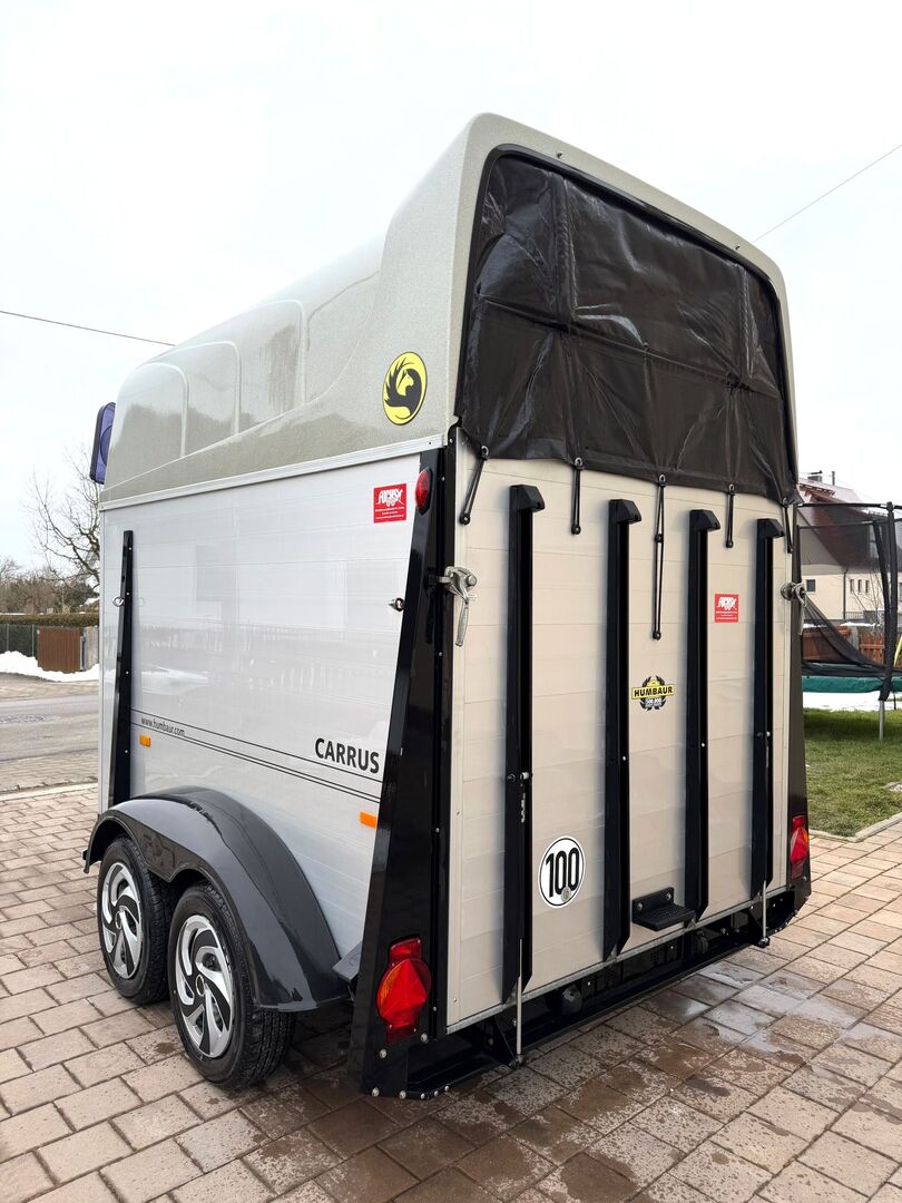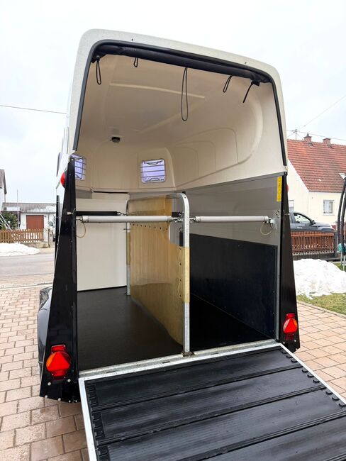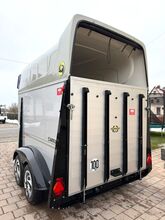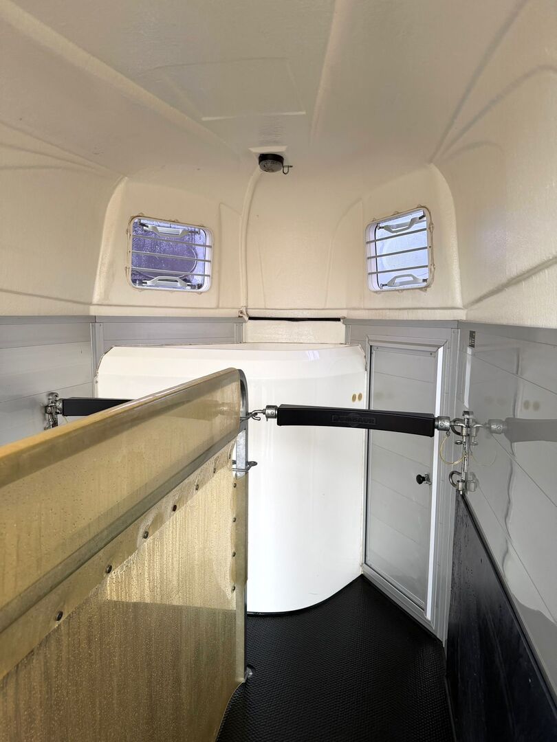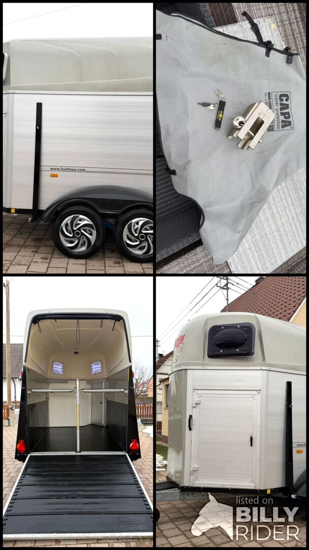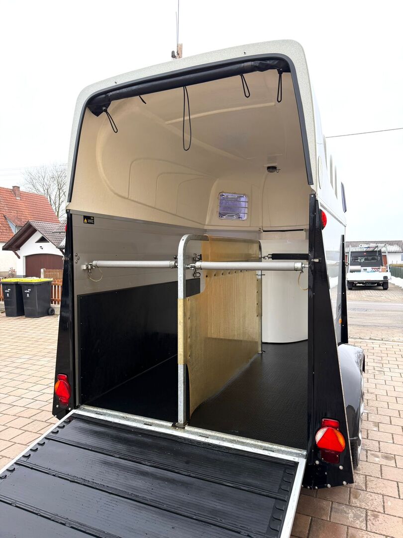 - First registration 08/2010 - Unladen weight 834 kg - Permissible total weight 2000 kg - Max. drawbar load 100 kg - HU until October 2027 - Automatic jockey wheel - Opening tinted windows - Champ chassis with shock absorbers for 100 km/h approval - Tires from 2024 - Panic system - Lockable tack room - Side stop on the loading ramp - Loading aid - Net roller blind - Interior lighting - Hay net holder - Integrated feed trough - PVC partition wall completely removable and adjustable with swivel bar - padded breast bars - step protection - Rubber floor glued and sealed - ALU FLOOR - Locking mechanism - Drawbar protection