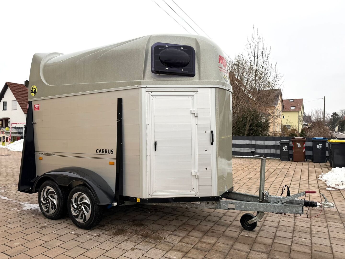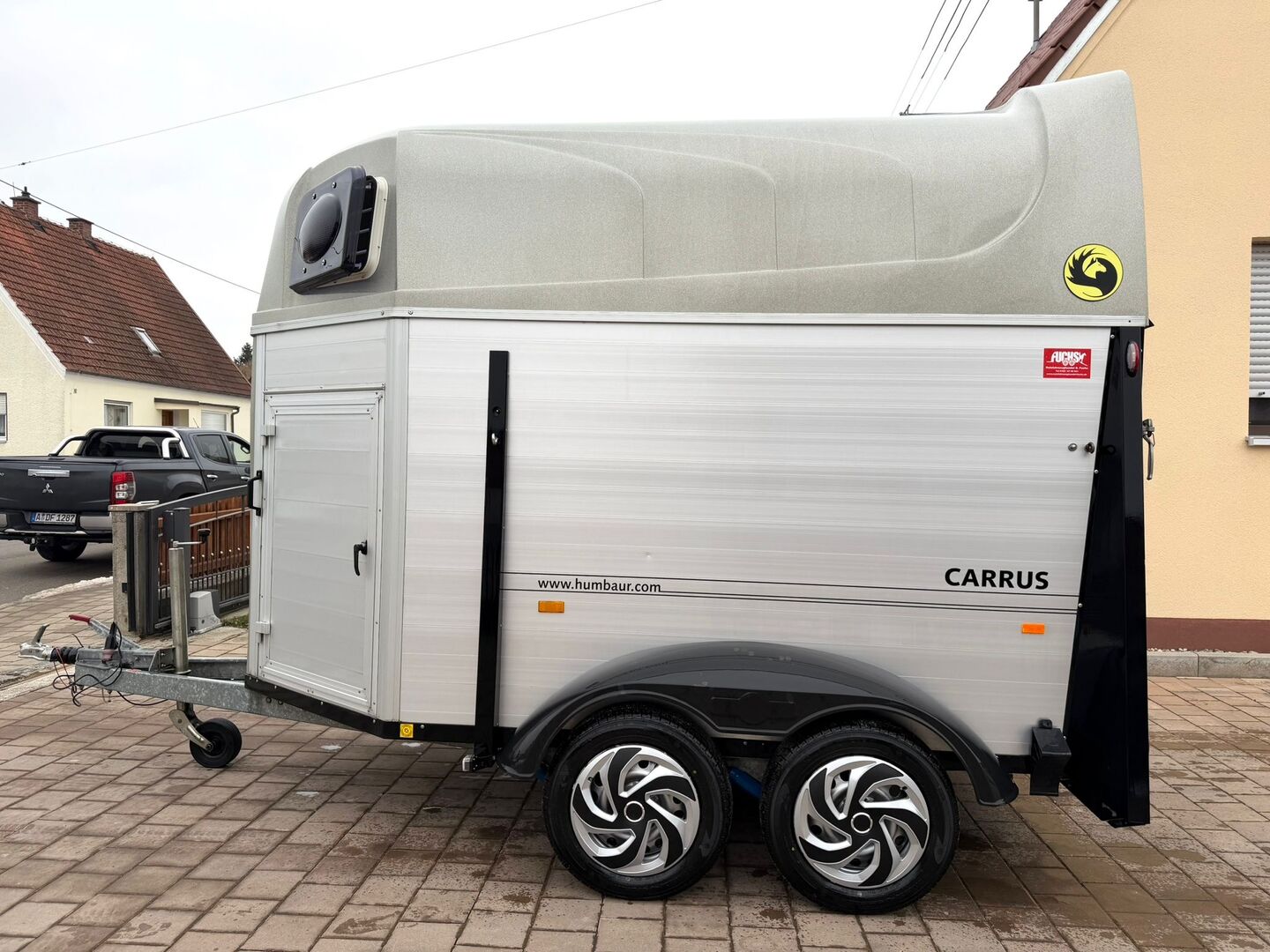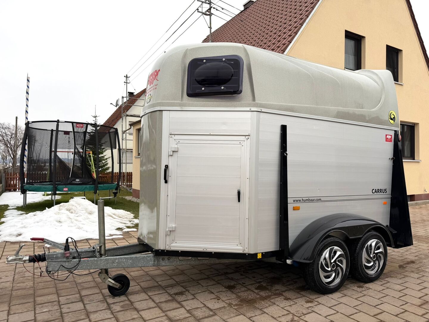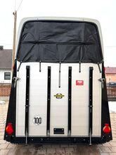- First registration 08/2010 - Unladen weight 834 kg - Permissible total weight 2000 kg - Max. drawbar load 100 kg - HU until October 2027 - Automatic jockey wheel - Opening tinted windows - Champ chassis with shock absorbers for 100 km/h approval - Tires from 2024 - Panic system - Lockable tack room - Side stop on the loading ramp - Loading aid - Net roller blind - Interior lighting - Hay net holder - Integrated feed trough - PVC partition wall completely removable and adjustable with swivel bar - padded breast bars - step protection - Rubber floor glued and sealed - ALU FLOOR - Locking mechanism - Drawbar protection