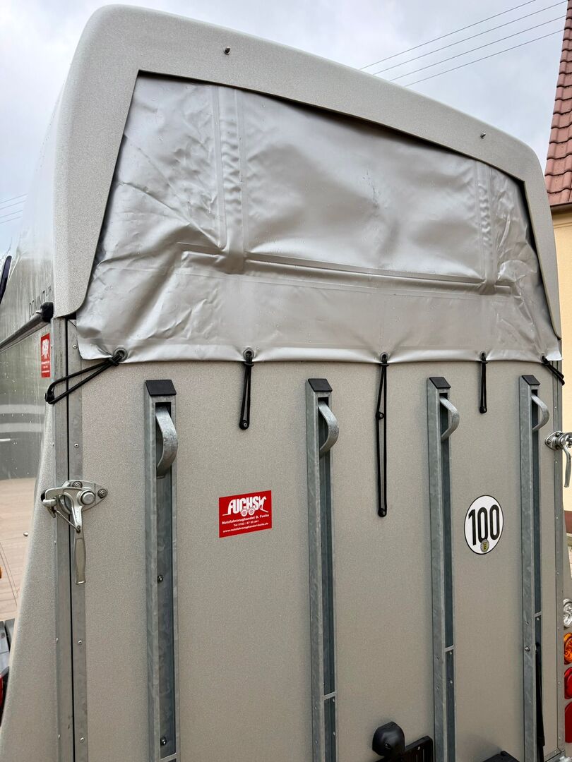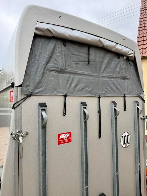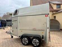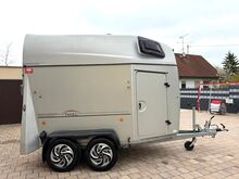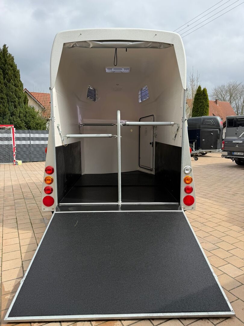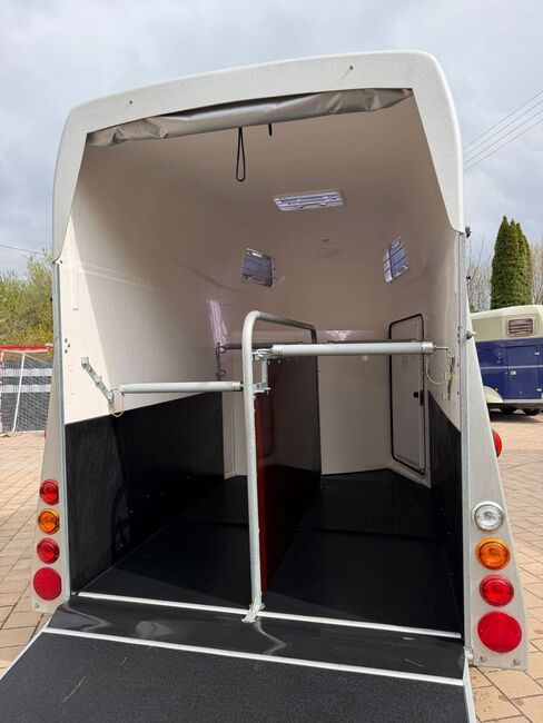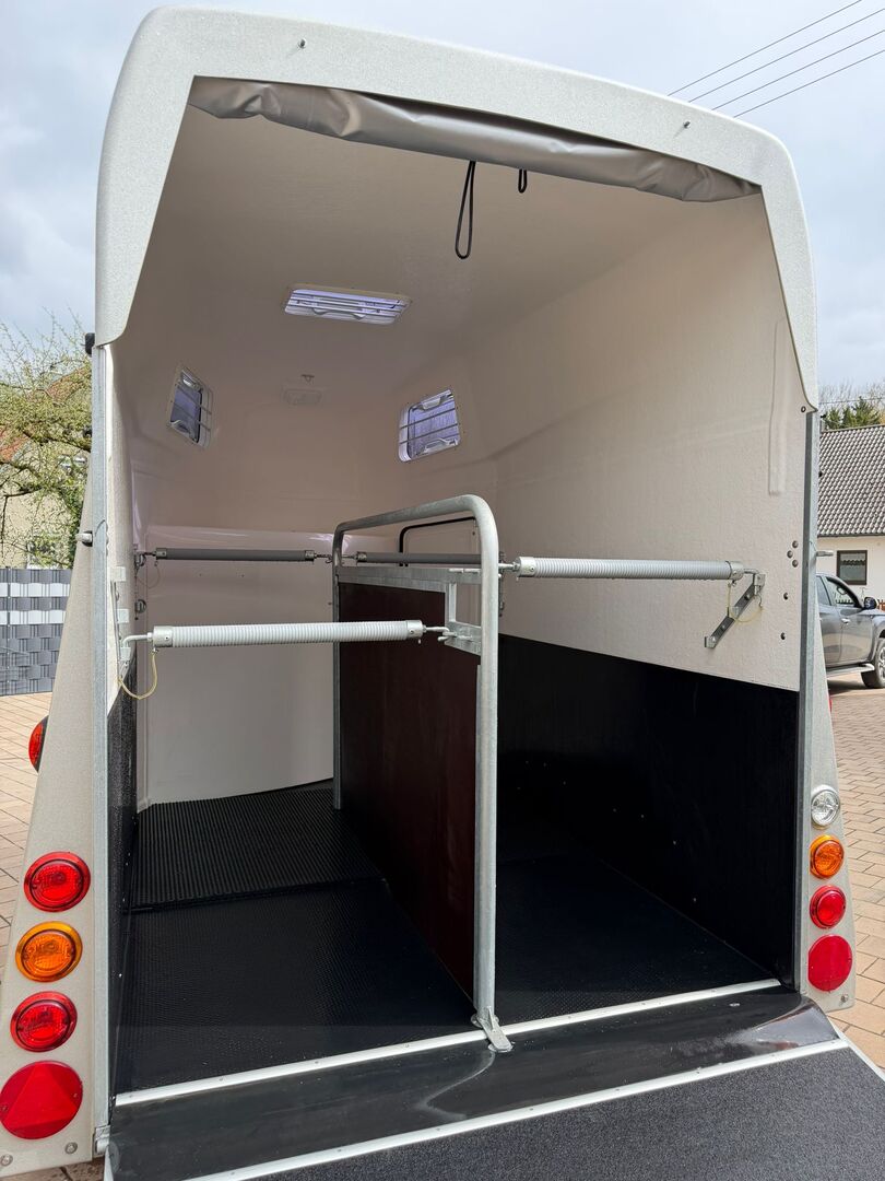 - First registration 07/2017 - Unladen weight 736 kg - Permissible total weight 2400 kg - Max. drawbar load 100 kg - HU until July 2027 - Automatic jockey wheel - Opening tinted windows - Panic system - Loading aid - tarpaulin lift / net lift - Dirt trap - Lockable tack room with pull-out saddle holders and brushes - ALUPLAST FLOOR - Rubber floor glued and sealed - PVC partition wall completely removable and adjustable with swivel bar - Pony compensation front and rear - step protection - side padding - Integrated feed trough - hay net holder - interior lighting - roof hatch
