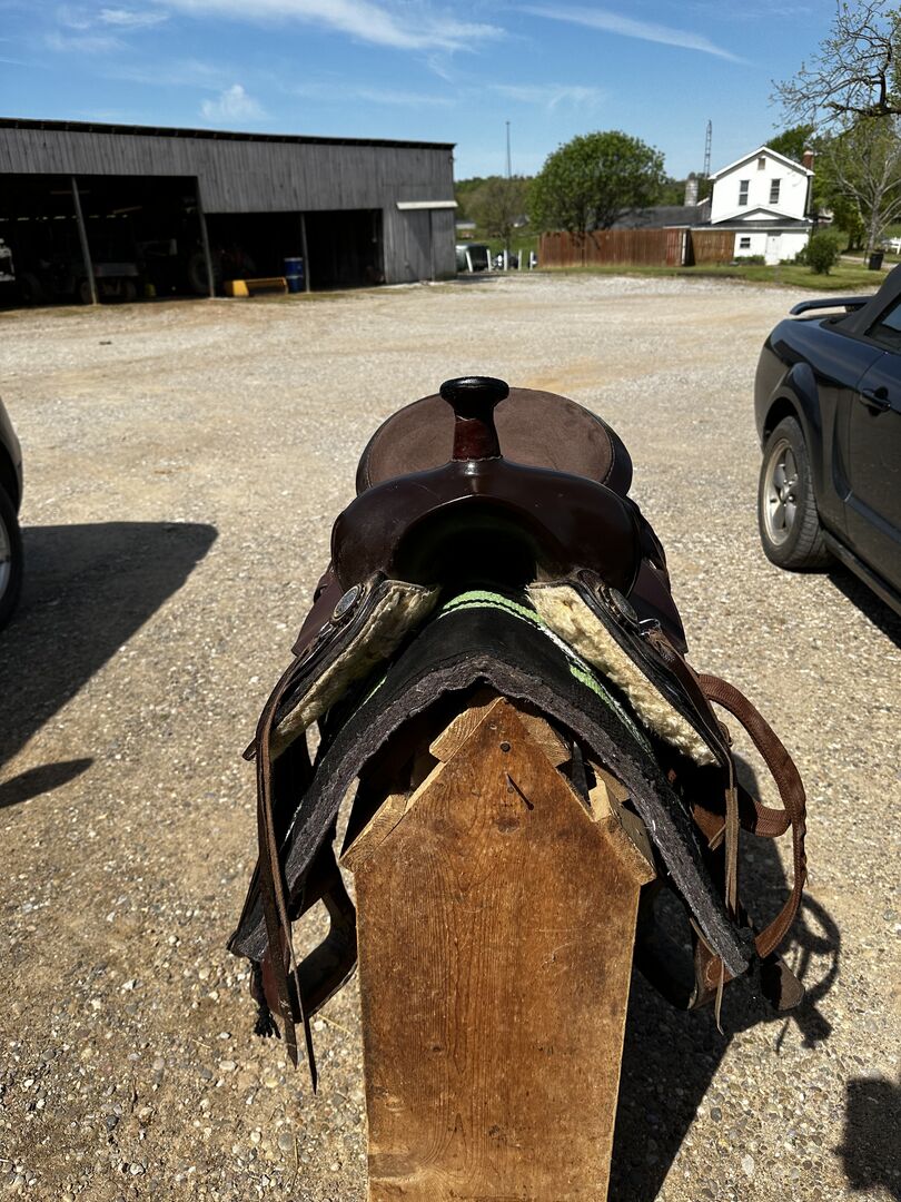 15” King Series Saddle. Rides like a 14” due to so much padding. It has a 7” gullet. It rides very nice and is very comfortable. It is in very good condition.