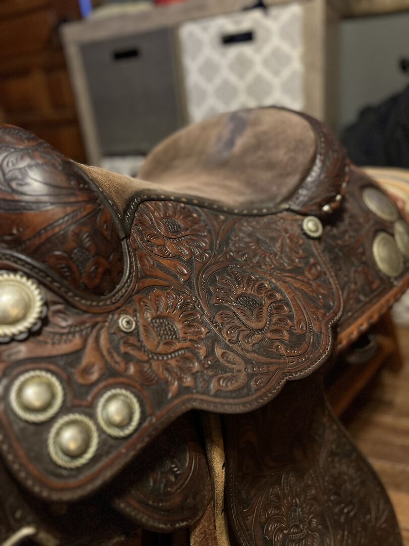 8 in gullet 15 in seat. In like new condition. Upkept. Still have matching stirrups.