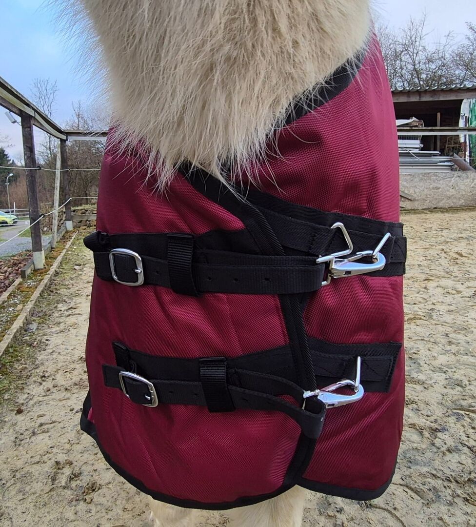 1680D highneck rain rug pony 115 125 winter rug 50g wine red 5000mm - Our best-selling all-season rain rug with 50g, often bought in winter as well as in heavy rain or draughty stables, due to the deep-seated sweat bib it is approx. 10cm longer, tight-fitting highneck, also fits horses with a wide stallion neck, price 159,90€, trade fair items with discount for 76,00€ for pony rug 105, 115, 125cm.