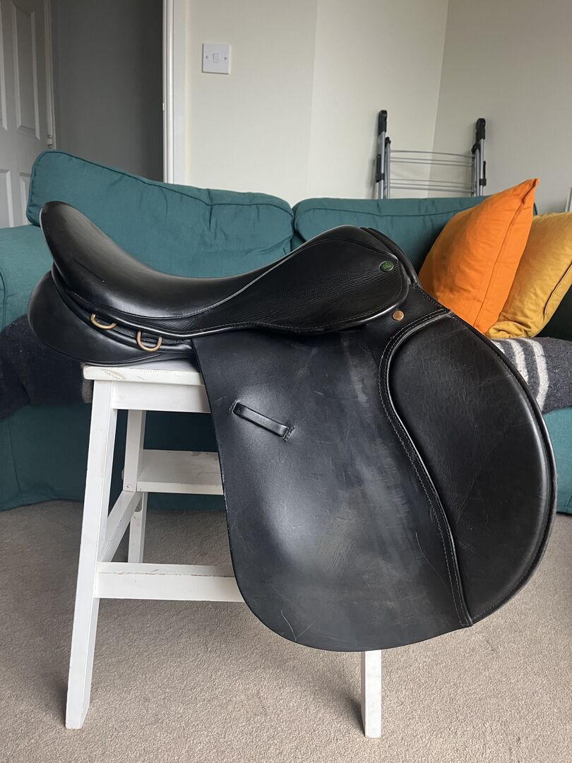 GP black Ideal Saddle 17.5” Very rarely used due to sale of horse, leather all in good nick one scuff on cantle from when stored (pictured) couple of superficial scratches on panel but otherwise almost like new has just been sat around for a while