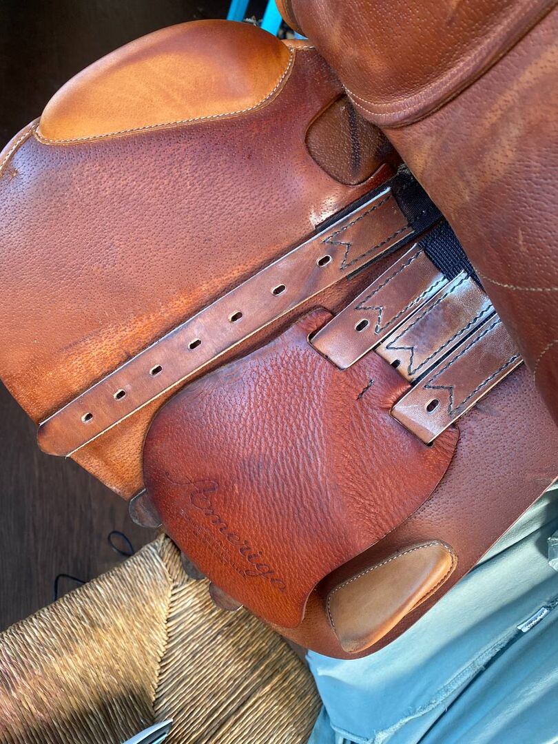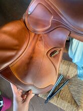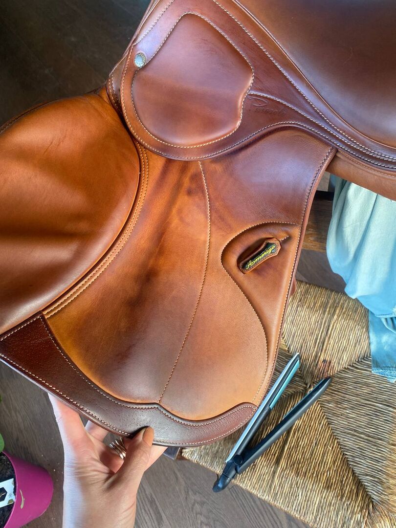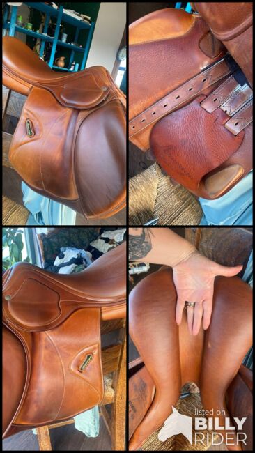 Mit seinem nach vorn geschnittenen Sattelblatt und den unterstützenden Kniepauschen ermöglicht er eine optimale Position und Stabilität über Sprüngen, bleibt aber auch auf der Ebene äußerst bequem. Das Leder ist weich und gepflegt und weist nur leichte, altersübliche Gebrauchsspuren auf.