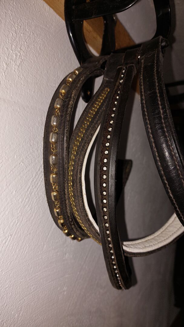 2 large moving boxes full of bridles and much more - I offer two boxes full of various snaffles, triangular reins, breastplates, reins, several martingales, leather halters and browbands.