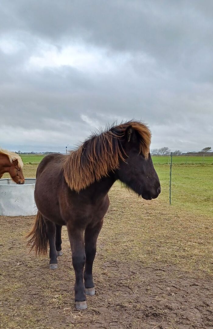 2 year old gelding by Odinn vom Habichtswald - Ölnir vom Nieblumerfeld FEIF-ID: DE2022122870 Born: May 29, 2022 Mother: Mön frá Eyrarlandi Sire: Odinn vom Habichtswald Sex: gelding Color: black stallion o.A.