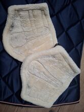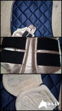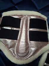 Set consisting of a dark blue saddle pad in DL with rose gold cord and rose gold gaiters in full. The saddle pad is completely unused, there are still a few hairs on the gaiters (dark spots on photo).