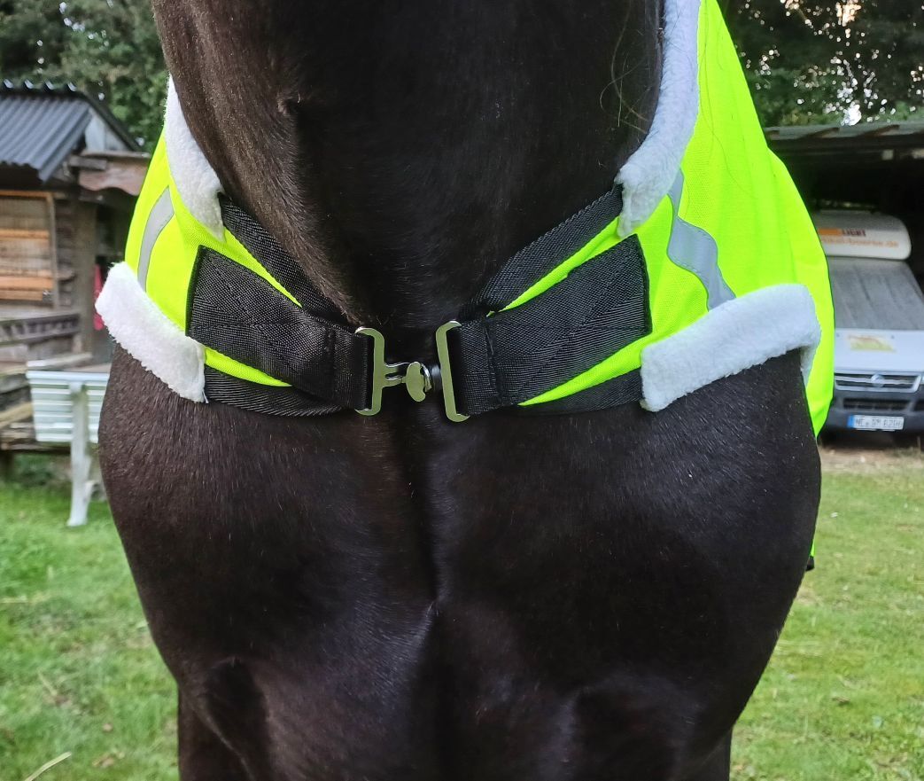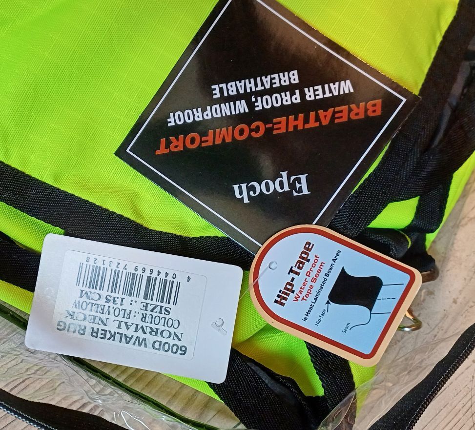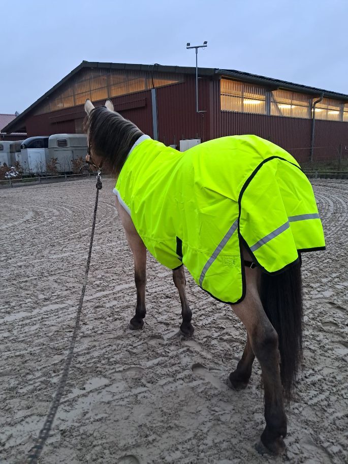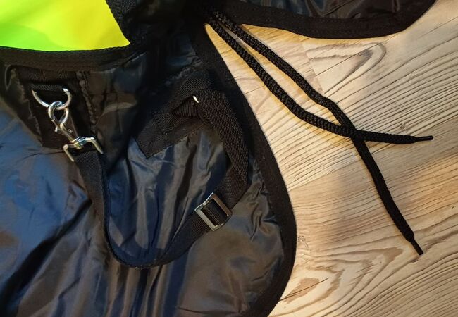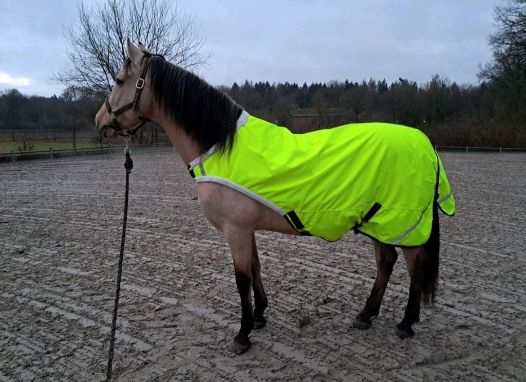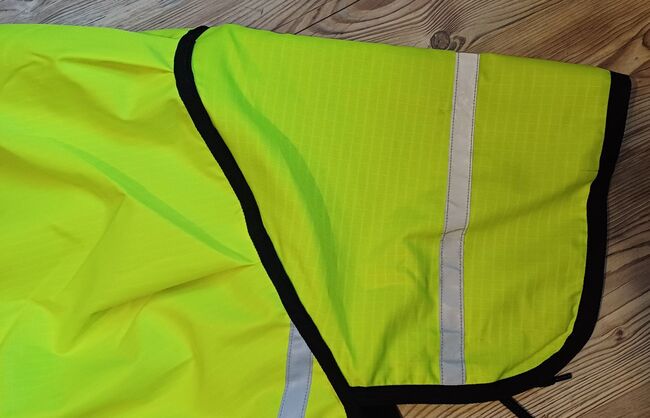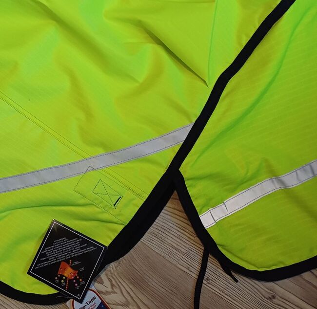 600D Ripstop Epoch special blanket outer fabric 3000mm water column fluoro yellow with reflective stripes, very breathable according to the manufacturer from -20° to + 45° (see label), fleece padding on withers, neck and shoulder pads, taped seams, 100% windproof, 100% breathable, 100% waterproof, 100g in the back area, fur-friendly taffeta lining on the underside T-breast fastener with rubber ring to prevent accidental opening, Cross surcingles with rubber ring to prevent unintentional opening, deep-seated tail flap, upper tail cord, lower strap with carabiner prevents the blanket from folding up when rolling, with zipper pocket Price 87,50€