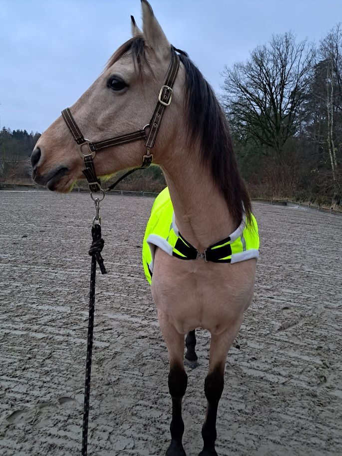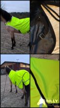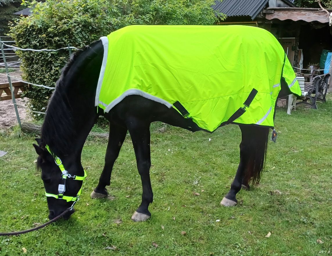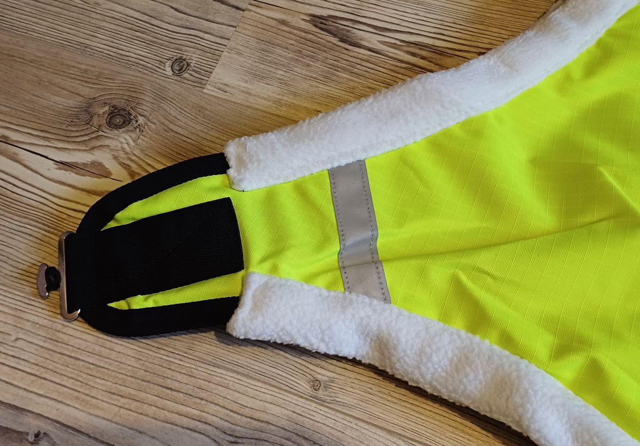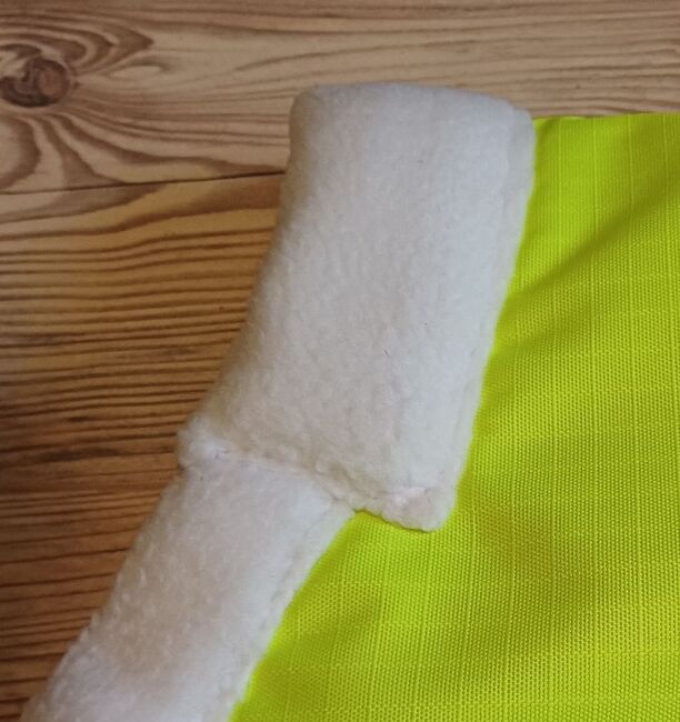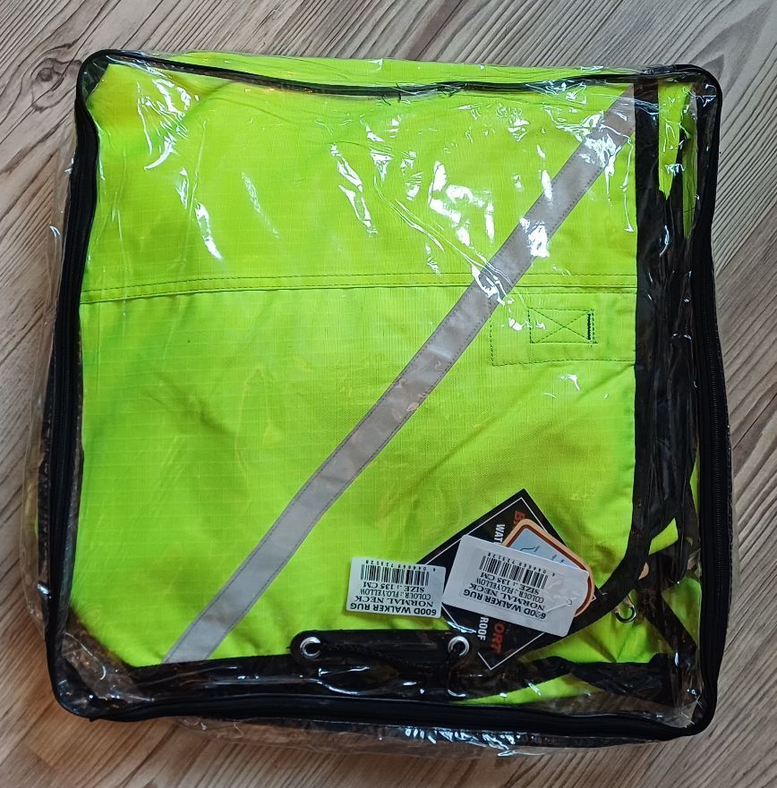 600D Ripstop Epoch special blanket outer fabric 3000mm water column fluoro yellow with reflective stripes, very breathable according to the manufacturer from -20° to + 45° (see label), fleece padding on withers, neck and shoulder pads, taped seams, 100% windproof, 100% breathable, 100% waterproof, 100g in the back area, fur-friendly taffeta lining on the underside T-breast fastener with rubber ring to prevent accidental opening, Cross surcingles with rubber ring to prevent unintentional opening, deep-seated tail flap, upper tail cord, lower strap with carabiner prevents the blanket from folding up when rolling, with zipper pocket Price 87,50€