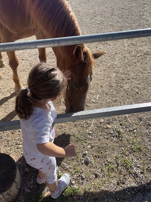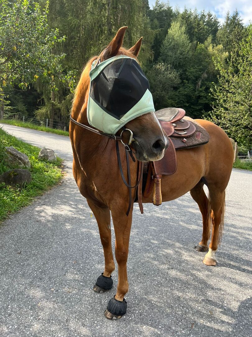 Our 17-year-old quarter pony mare (143 cm) is for sale, a real dependable pony with a golden character. She is mainly ridden off-road and is an absolute life insurance there - calm, attentive and fearless. Whether alone or in a group, she remains reliable and calm at all times. The mare is a real children's pony, well-behaved, friendly, people-oriented and always cooperative. She is ideal for children, young people or small adults who are looking for a safe leisure horse. She is suitable for beginners, but you have to be able to assert yourself. (mare meets Haflinger with Tyrolean stubbornness) 😉 She is known to have osteoarthritis, but this has never caused any problems. She is fully resilient in the leisure arena, runs cleanly and is ridden regularly. The arthrosis is openly stated, but is not restrictive in everyday life.