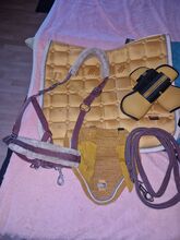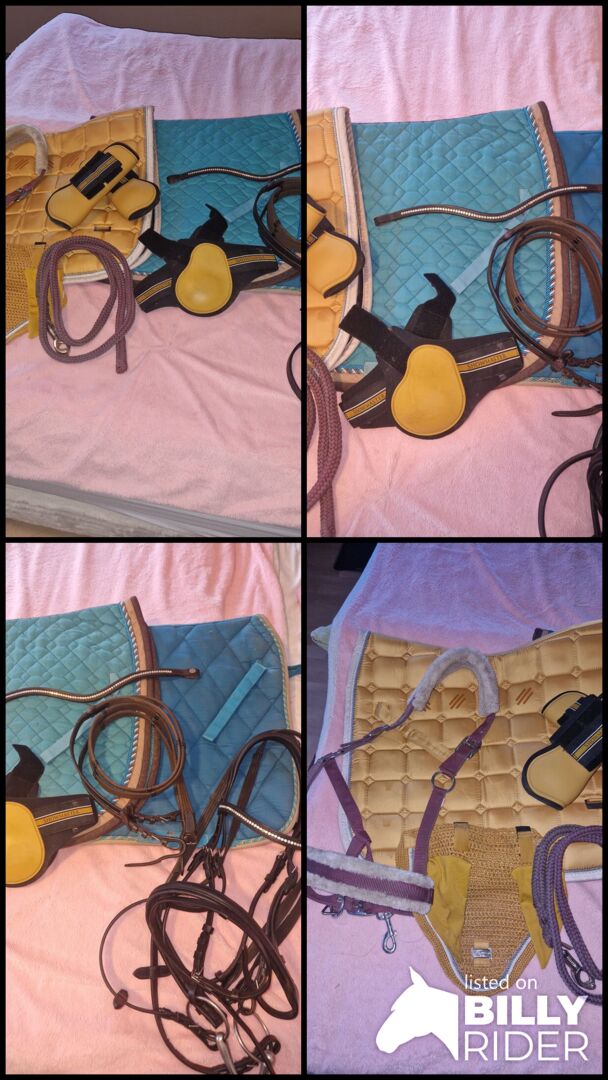 Black snaffle with reins Brown reins Brown browband Gaiters and fetlock boots Halter with fur and matching rope Fly bonnet DR saddle pads