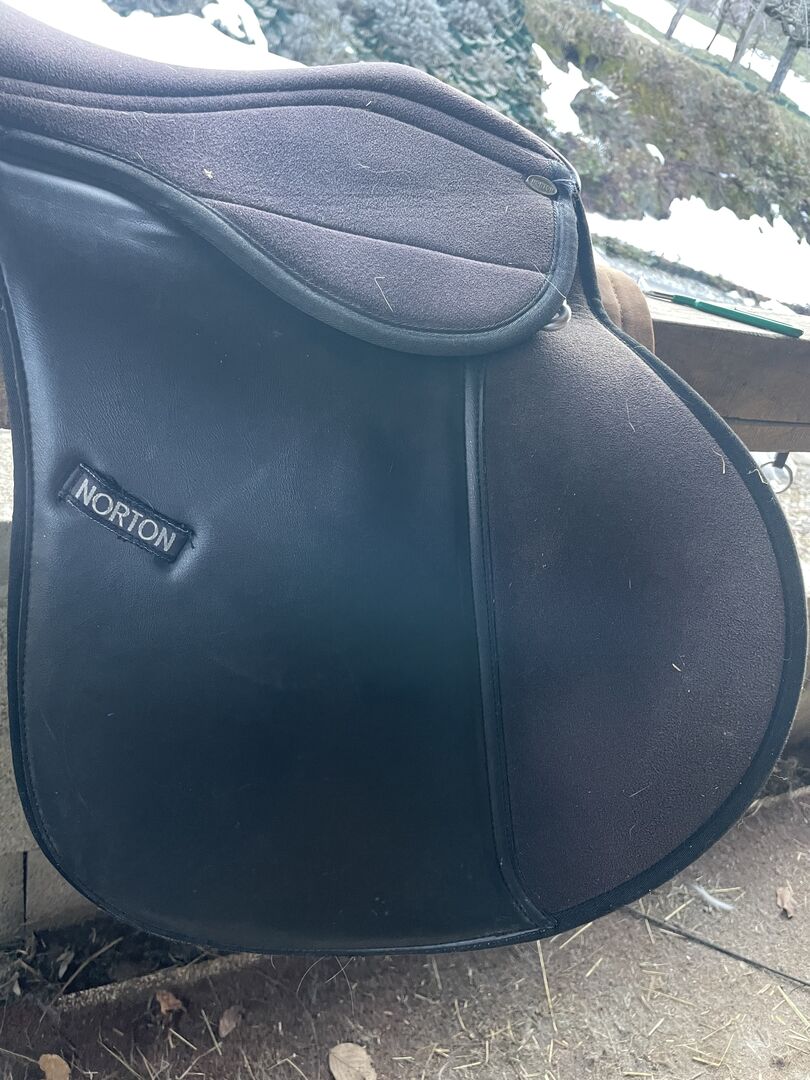 18'' coles black norton saddle. no injuries. kommore 32/33. i can add stirrups and 130cm long girth