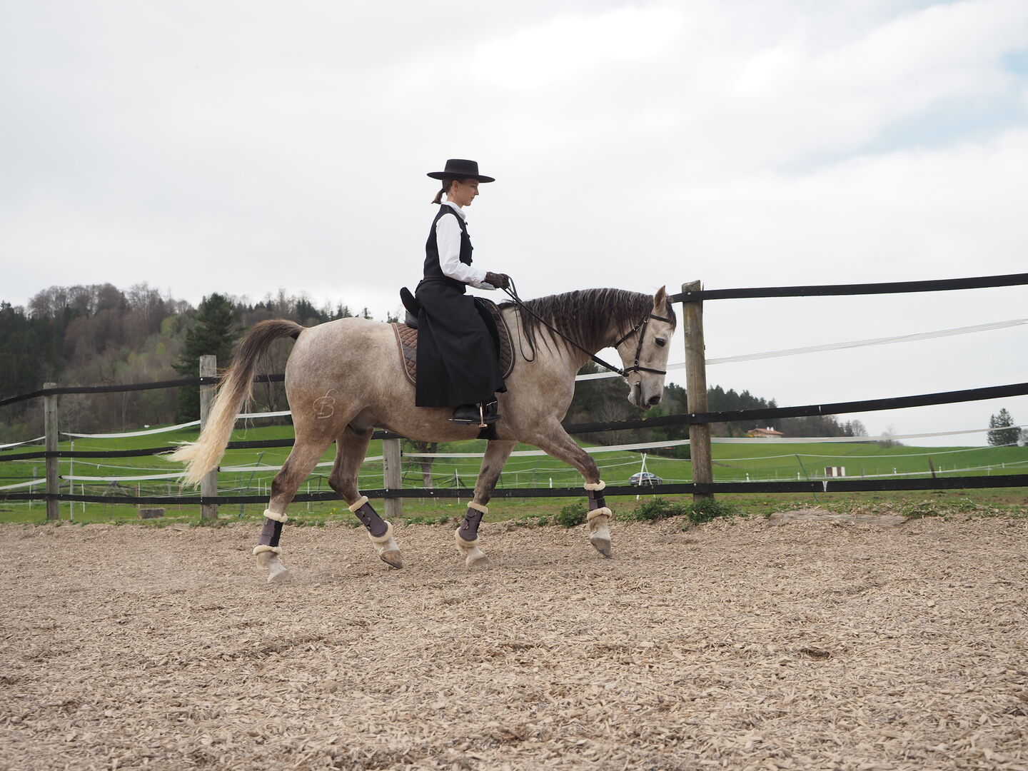He has been ridden and knows lateral movements in walk and trot, as well as first approaches such as Spanish walk and half-passes.