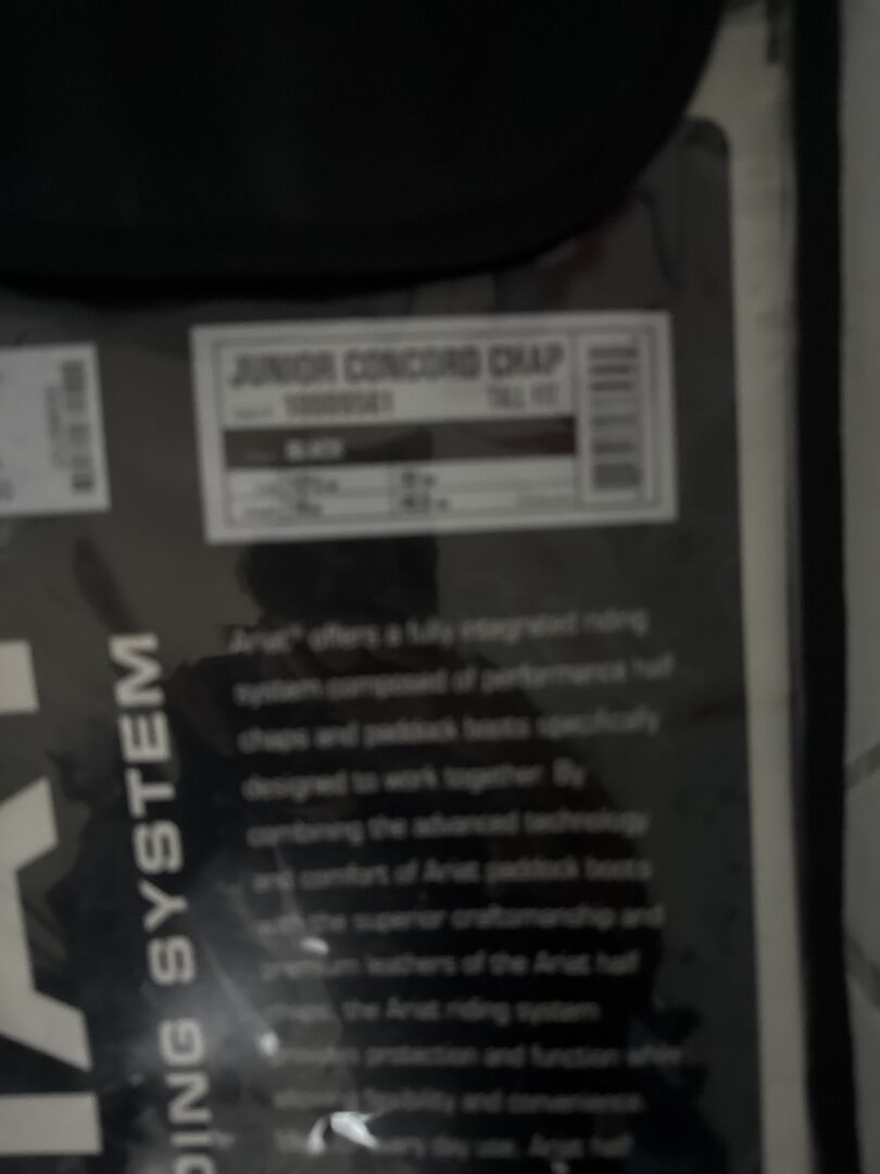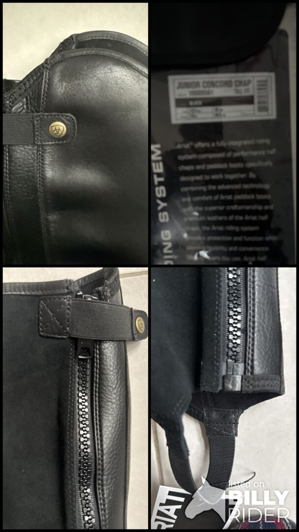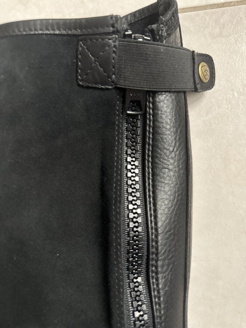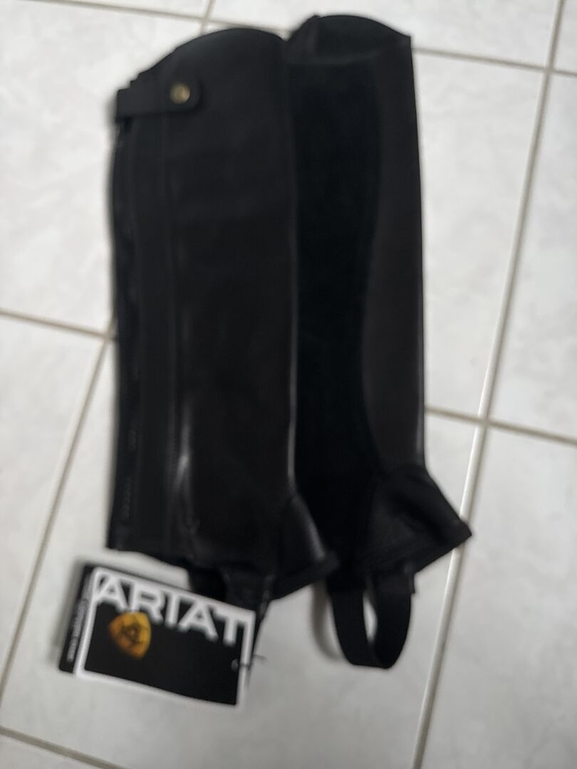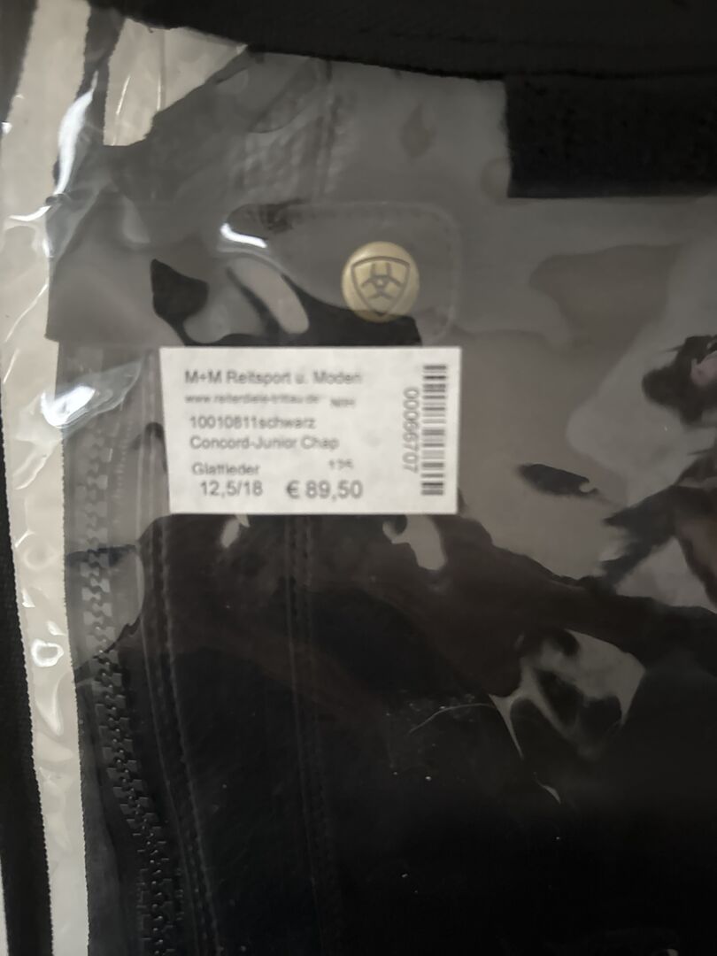 Arian riding chaps, new, top offer - I am offering new unworn riding chaps from Ariat. They were a gift, but unfortunately they don't fit me. They are the model "Junior Concord Chap", size "Tall Fit" - in cm 32cm width and 45.5 cm height in black. The chaps have a full length zipper (see photo) and can be put on comfortably. The original price is 89€