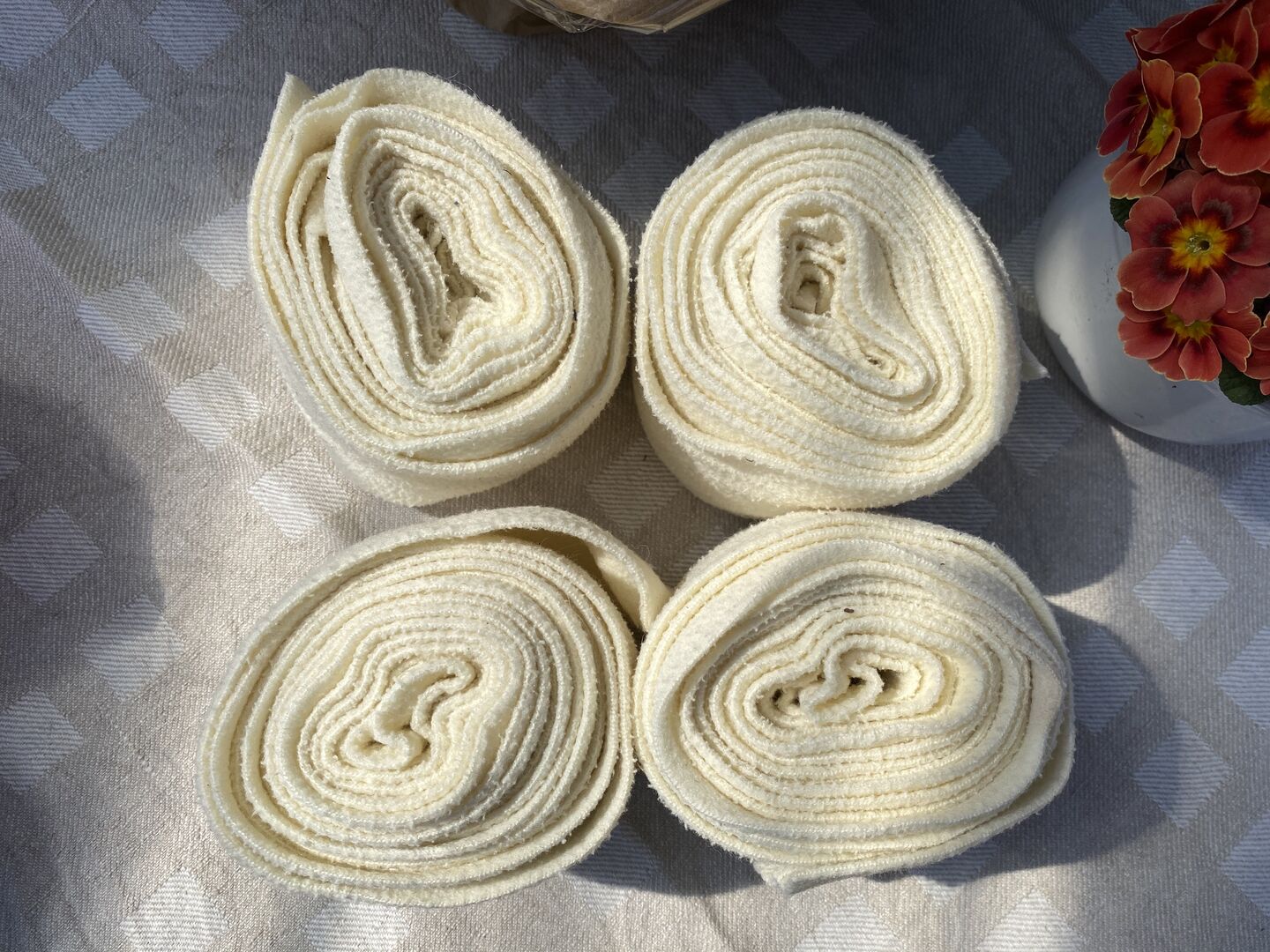 Bandages, different colours - Offer here three pairs of bandages in the colors red, orange and cream white. All pairs are used, but in good condition. Per pair 5,-€.