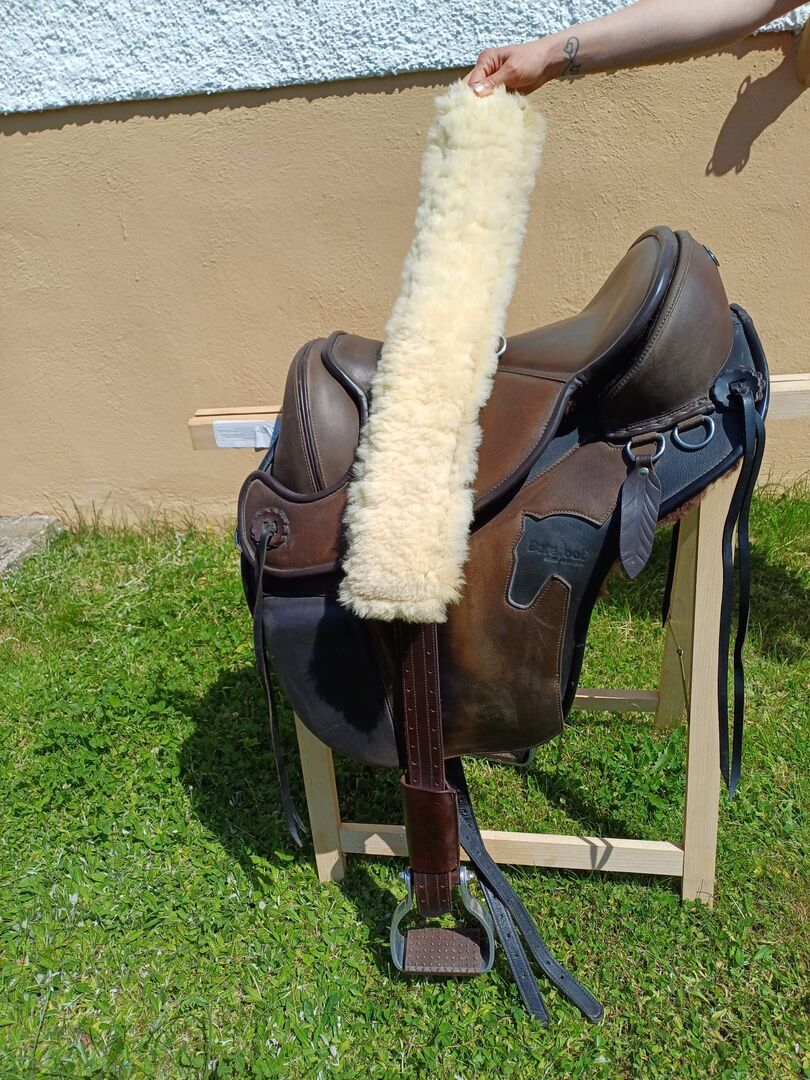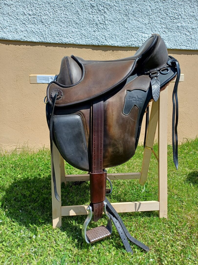For sale versatile, horse-friendly saddle model in very good condition (hardly any signs of use, no visible rough marks) Description: - ideal for cross-country and trail riders - freely positionable stirrup suspension (5cm) - flexible V-girth - thick woven fur underside - weight only approx. 6 kg - Color: brown/black with horse head - Delivery includes saddle cover and changeable pommel - Size: 1 corresponds to: Saddle length: 50 cm Seat length: 35 cm saddle flap length: 53 cm recommended for women's size: 36-40