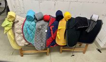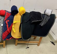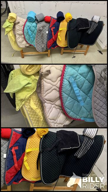 Bargain package with 7 dressage saddle pads, 18 bandages & fly ears - For sale here a colorful package with 7 dressage saddle pads in different colors.