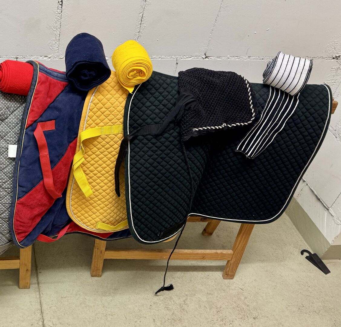 The set contains: - 7 saddle pads (black is new, the others are used) - Approx. 18 matching bandages - 2 fly ears
