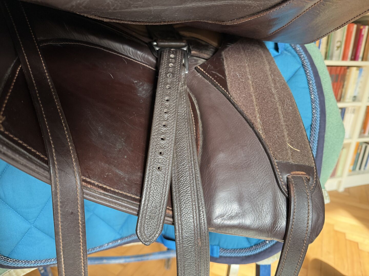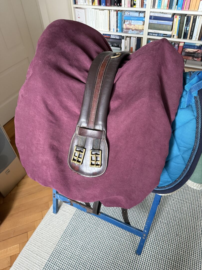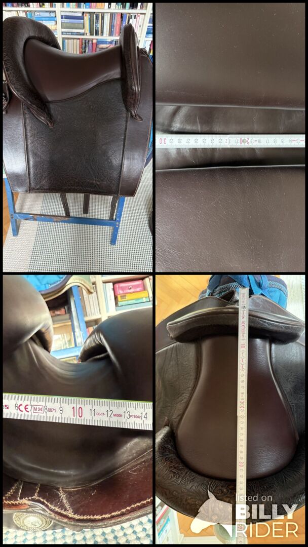 Baroque saddle leather tree by Reinhold Pecher, short back, Spanish - Very beautiful and super comfortable baroque saddle El Noble with leather tree from the saddle manufacturer El Sueño by Reinhold Pecher. The saddle was made for a short Spanish horse. I opted for the leather tree as my horse was still young and not very muscular. The saddle has practically 'grown' with the horse without having to be altered and was ridden for approx. 2 years as there was a second saddle available, so the saddle has few signs of wear and the padding is impeccable, please refer to the pictures for the measurements. The seat is made of durable leather, side panels and gallery are made of embossed padded leather, kept thin to be closer to the horse. Short girth and stirrups included. New price 3,800 euros. Invoice available