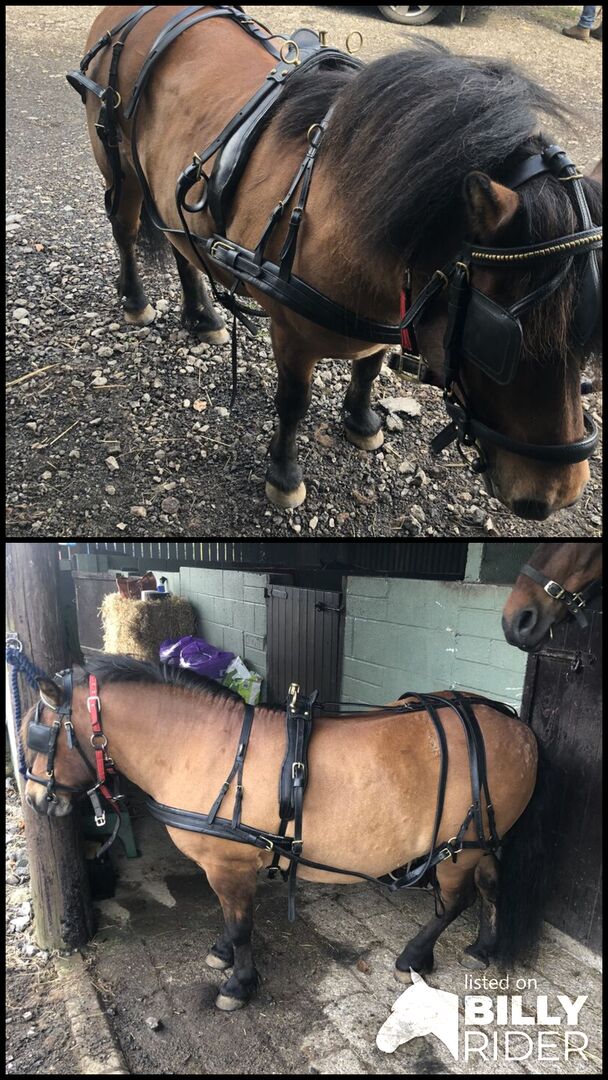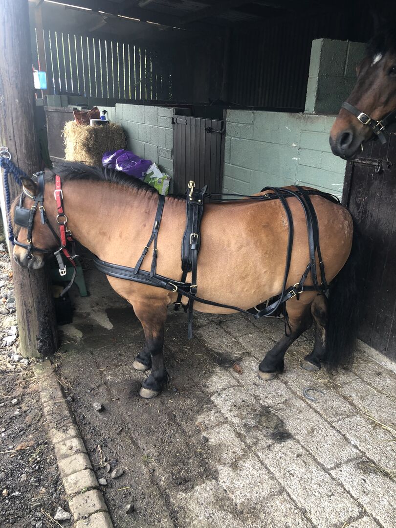 Black leather harness with brass buckles and box keepers to fit large standard Shetland to 12/13h Welsh b type.