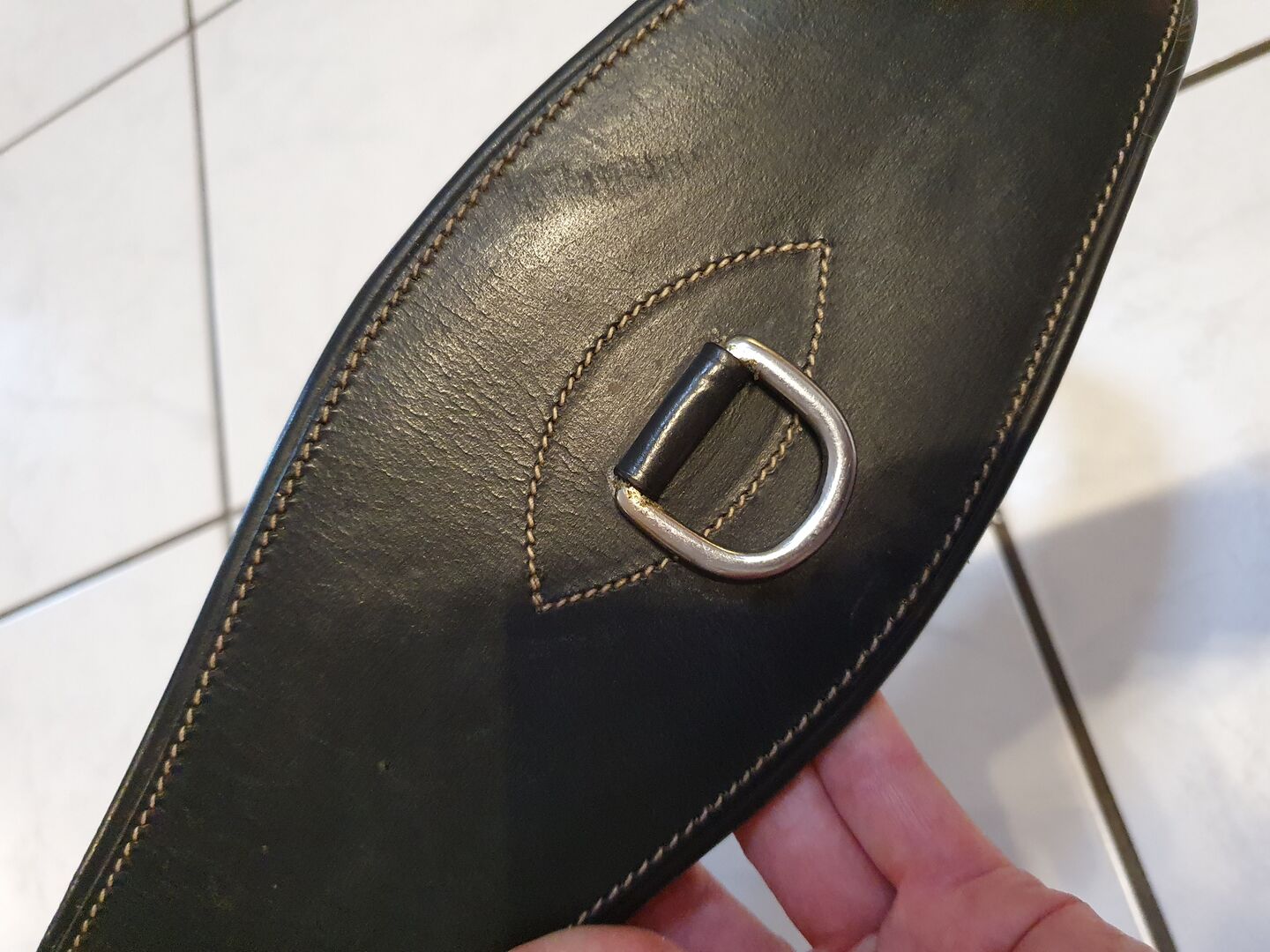 Black leather saddle girth 120 cm, top condition - Sell my very little used but always maintained black leather girth in 120 cm length. The horse has gained weight too quickly, now it no longer fits. Elasticated on both sides and roller buckles, a ring in the middle for auxiliary reins. No cracks in the leather, rust or chafed rubber.