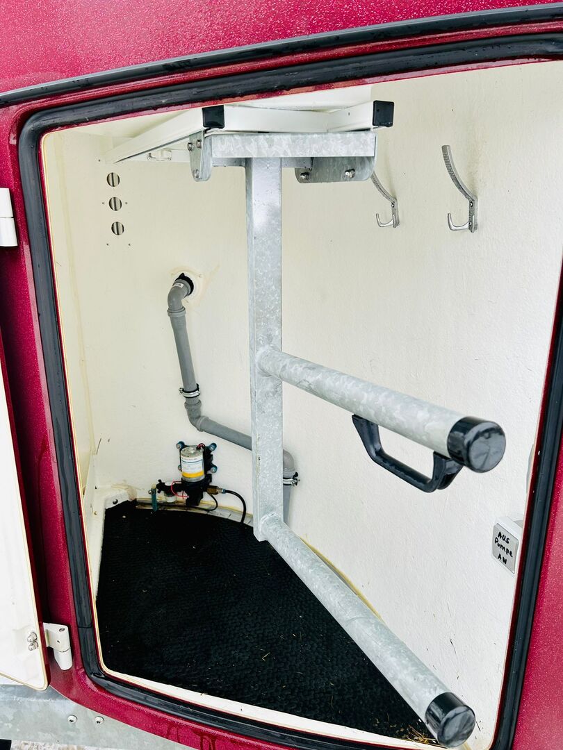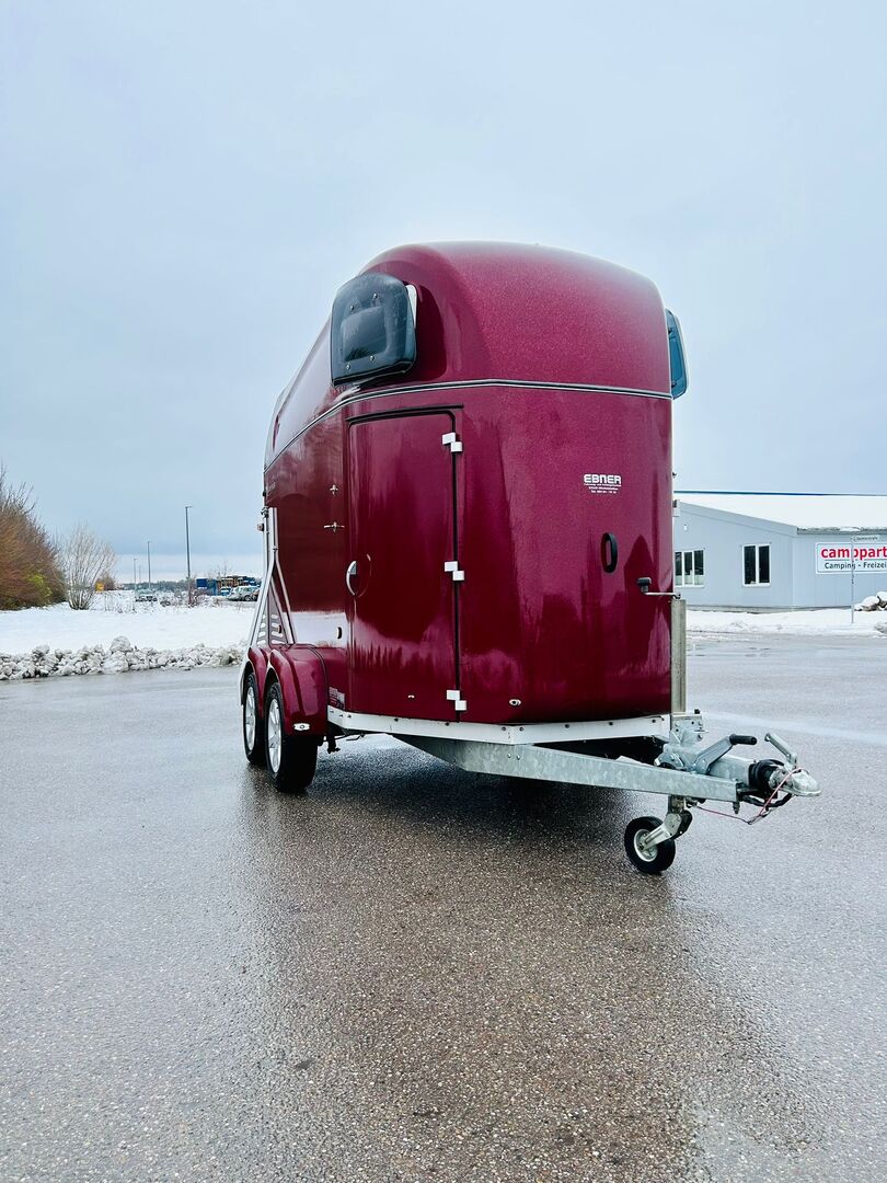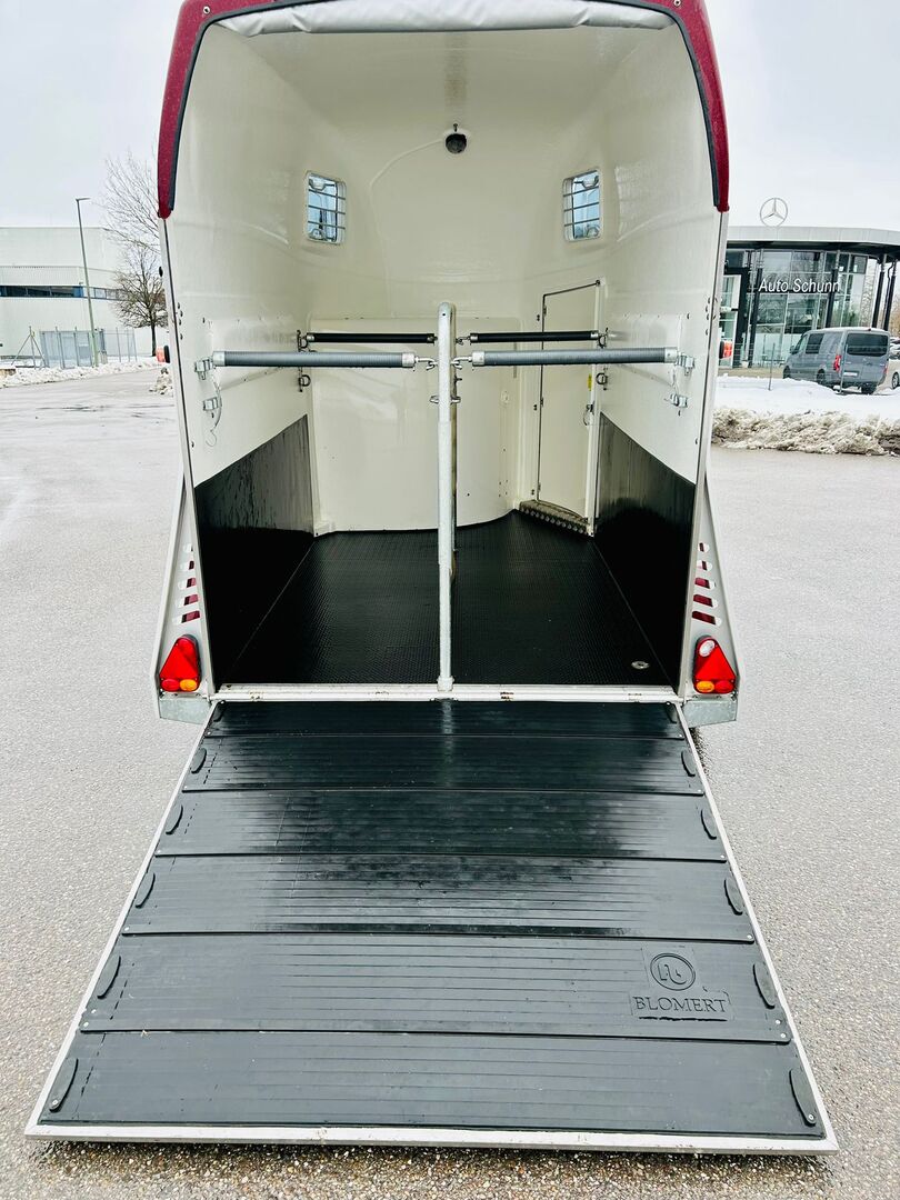 Blomert New Star full polyester 2 horse trailer - - First registration 2013 - MOT until 11.2025 - First hand - Permissible total weight 2,400kg - Unladen weight 920kg - Independent suspension - Aluminum rims - 100km/h approval - Aluminum floor - Mudguards in body color - Panic system - Hinged side windows - Step protection - Lockable tack room - Automatic tarpaulin blind - Built-in water tank with feed pump - Feeding trough