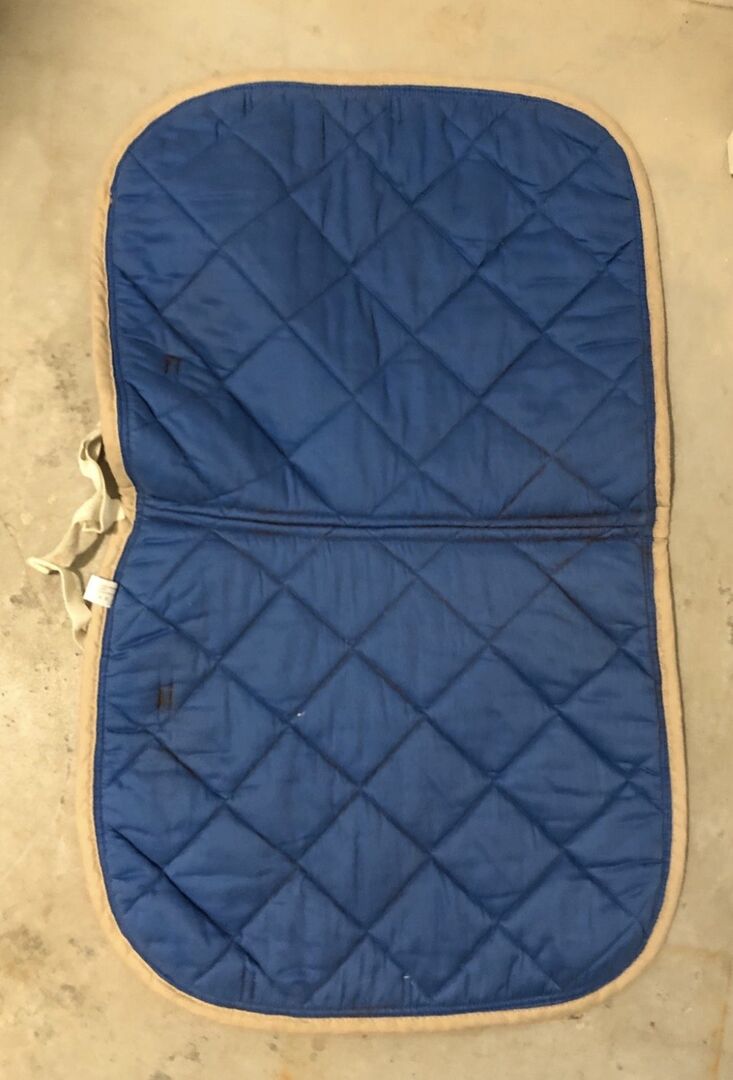 Blue dressage saddle pad with beige border FULL - Blue saddle pad with cord and beige trim. I have used it for both jumping and dressage, although it is not the typical size of a dressage saddle pad.