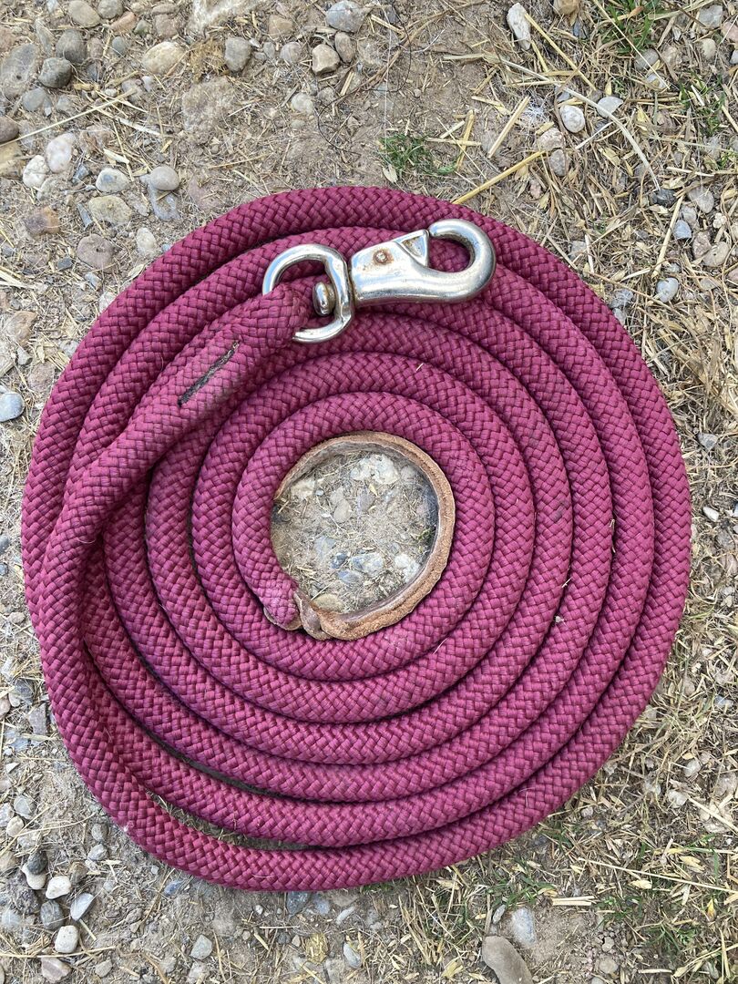Ich verkaufe ein Weinrot (Bordeaux) farbenes Bodenarbeitsseil in 3 Meter länge mit sicherem Verschluss (s. Foto). 2-3 mal benutzt, daher die Sandreste, leider aber vom rumhängen auch Rostflecken.