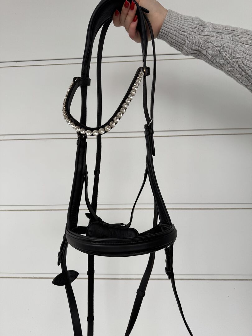 Bridlery bridle Choice with browband and reins - Bridlery bridle "Choice" in WB with anatomical headpiece. Includes the "Stunning White" browband, leather reins and the "Travel" snaffle bag.