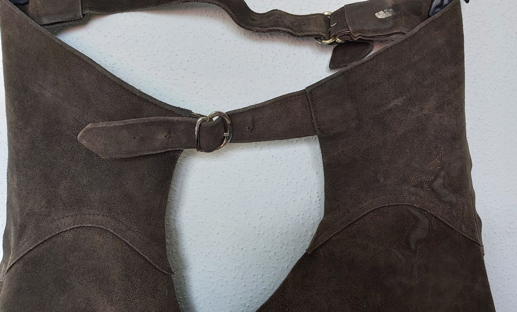 Chaps from Meindl - High quality used chaps, dark brown, size adjustable with 2 fasteners at the front and back. Very good condition (pictures). Total length 105 cm Thigh 60 cm Leg end 32 cm From crotch length 80 Hip circumference (pictured) 1st (last) hole 82 cm; Size and condition shown!