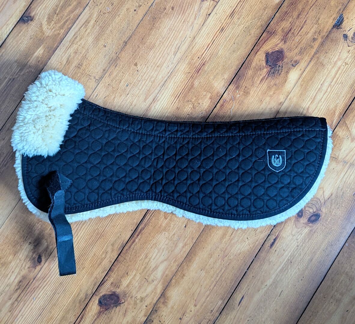 The "Standard" saddle pad from Christ impresses with its beautiful appearance and many useful functions. The back line is adapted to the horse's back so that it fits perfectly and is therefore comfortable to wear. The material is genuine lambskin on the underside, which has an approximate height of 30 mm and is pulled around to the top at the front to serve as a saddle pad. The top consists of several components of special saddlecloth fabric, which are quilted together. This fabric not only looks elegant, but is also hard-wearing and robust, so that the saddle pad has a long service life. The saddle pad is attached to the girth straps of the saddle with Velcro strips, is easy and extremely quick.