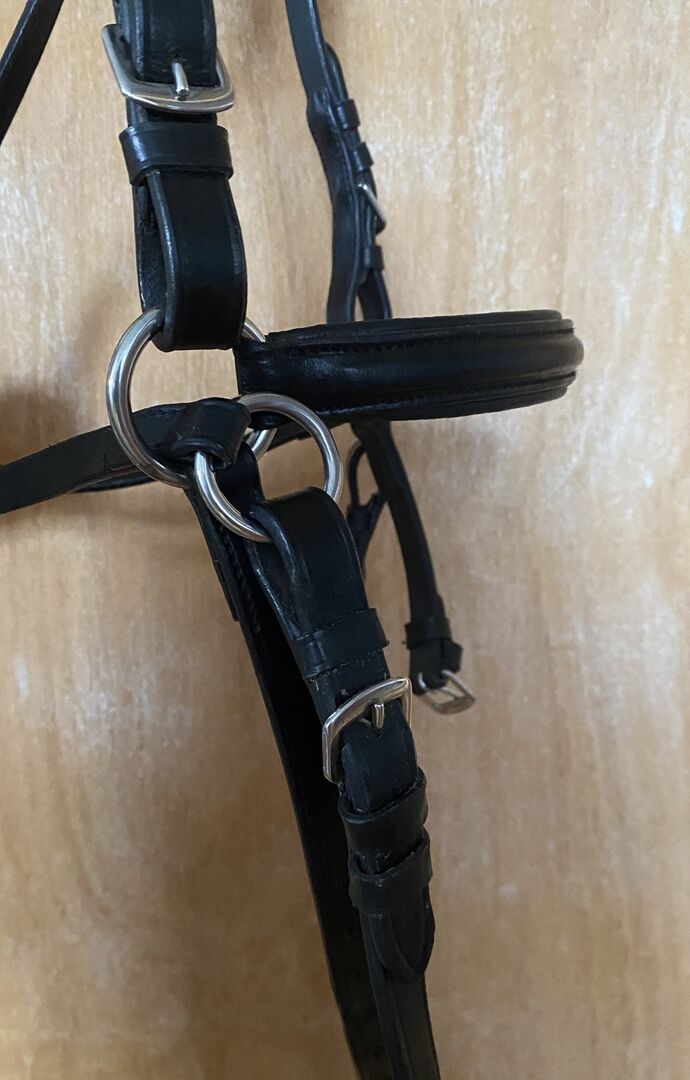 Claridge House Bitless Bridle - Sidepull Size COB - The horse-friendly bitless bridle is easy to put on like a stable halter, but versatile and differentiated in effect. Made of supple leather. Neck, brow and noseband are softly padded. With easy-grip web reins. Original price 65€ Material info & features: Softly lined Horse friendly Grip web reins Versatile in effect Bridle was tried by us for our young horse a few times, but she did not like the lead under the chin. We have now switched to plain sidpull. Unfortunately our youngster caught the halter once and chewed on it, these are the traces on the two close-up pictures. Are just small blemishes unfortunately. Otherwise like new!
