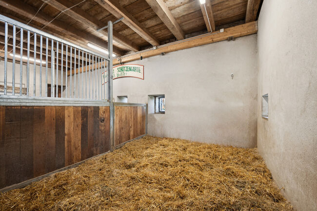 The horse stable was built by the renowned company AS Pferdestall and comprises three indoor boxes (3.2 m x 4.4 m), each with heated drinking troughs. A fourth box (3 m x 4 m) is currently used as a tack and feed room. Above the boxes is a large 42 m² hay and straw store with space for up to 15 tons.
