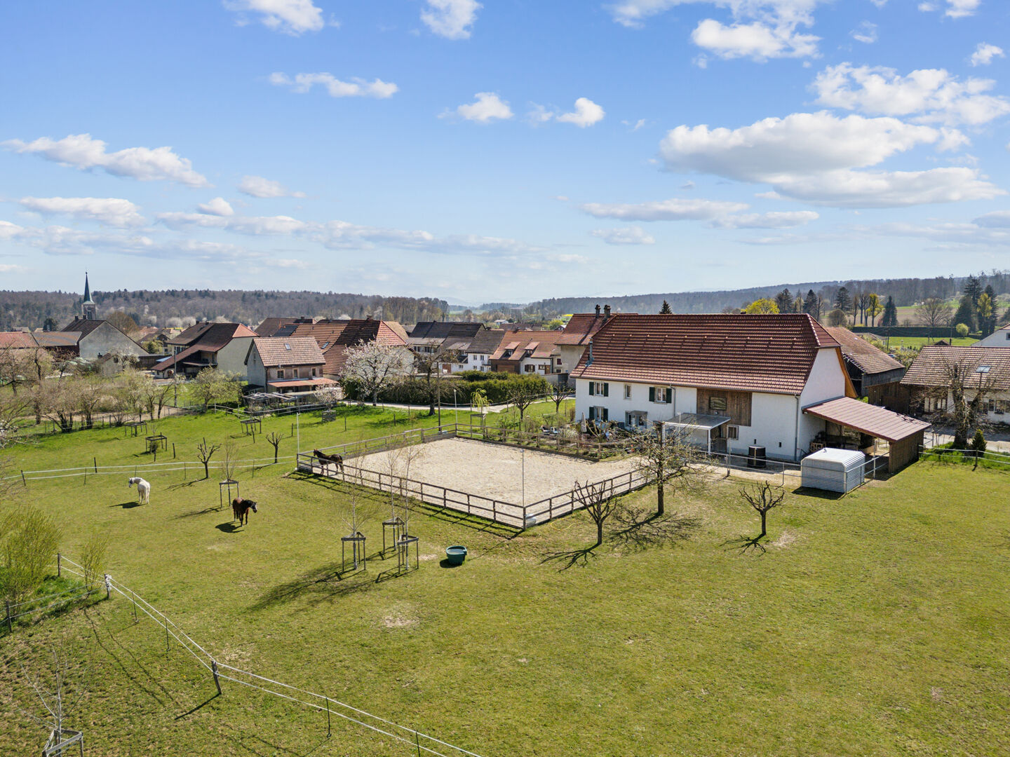 COMPLETELY RENOVATED EQUESTRIAN PROPERTY IN AN IDYLLIC SETTING FOR PRIVATE HORSE KEEPING - Nestled in the idyllic countryside of the canton of Jura, this exclusive equestrian property offers a rare opportunity to combine living and keeping horses. The unique combination of a high-quality renovated farmhouse, well thought-out infrastructure for horses and the breathtaking surroundings make this property a dream property for every horse lover.