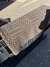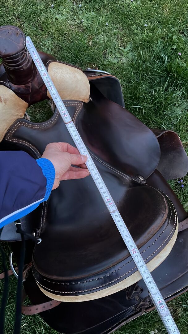 Heavy Continental western saddle with extra stirrups and riding pad. Mounted on a quarter horse that has unfortunately become too old to carry the heavy saddle.
