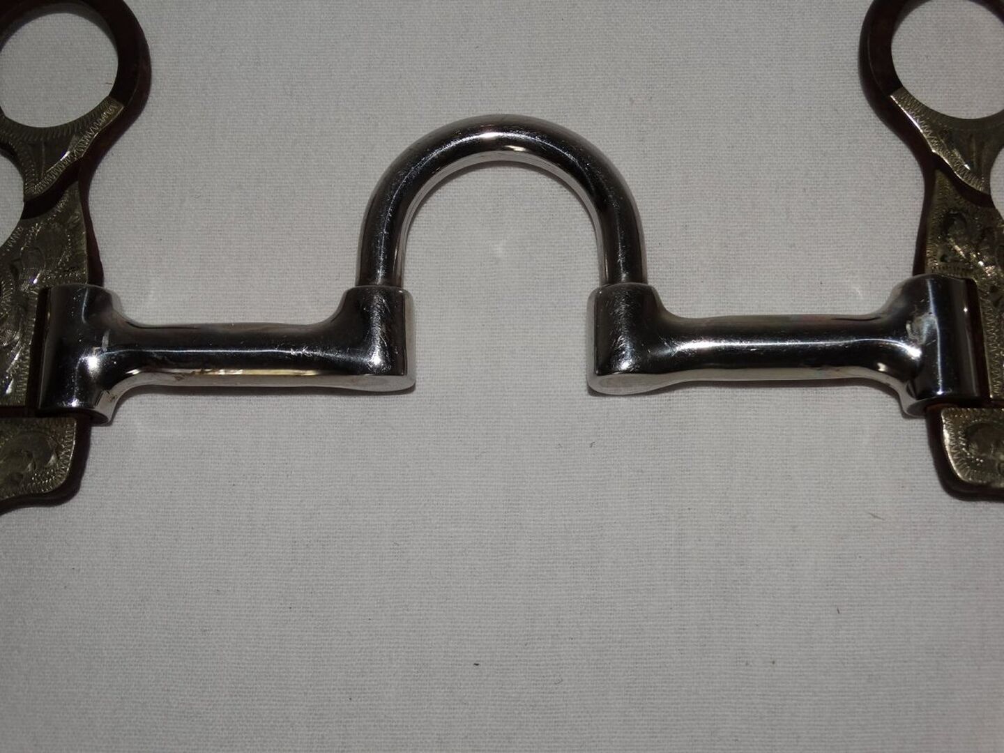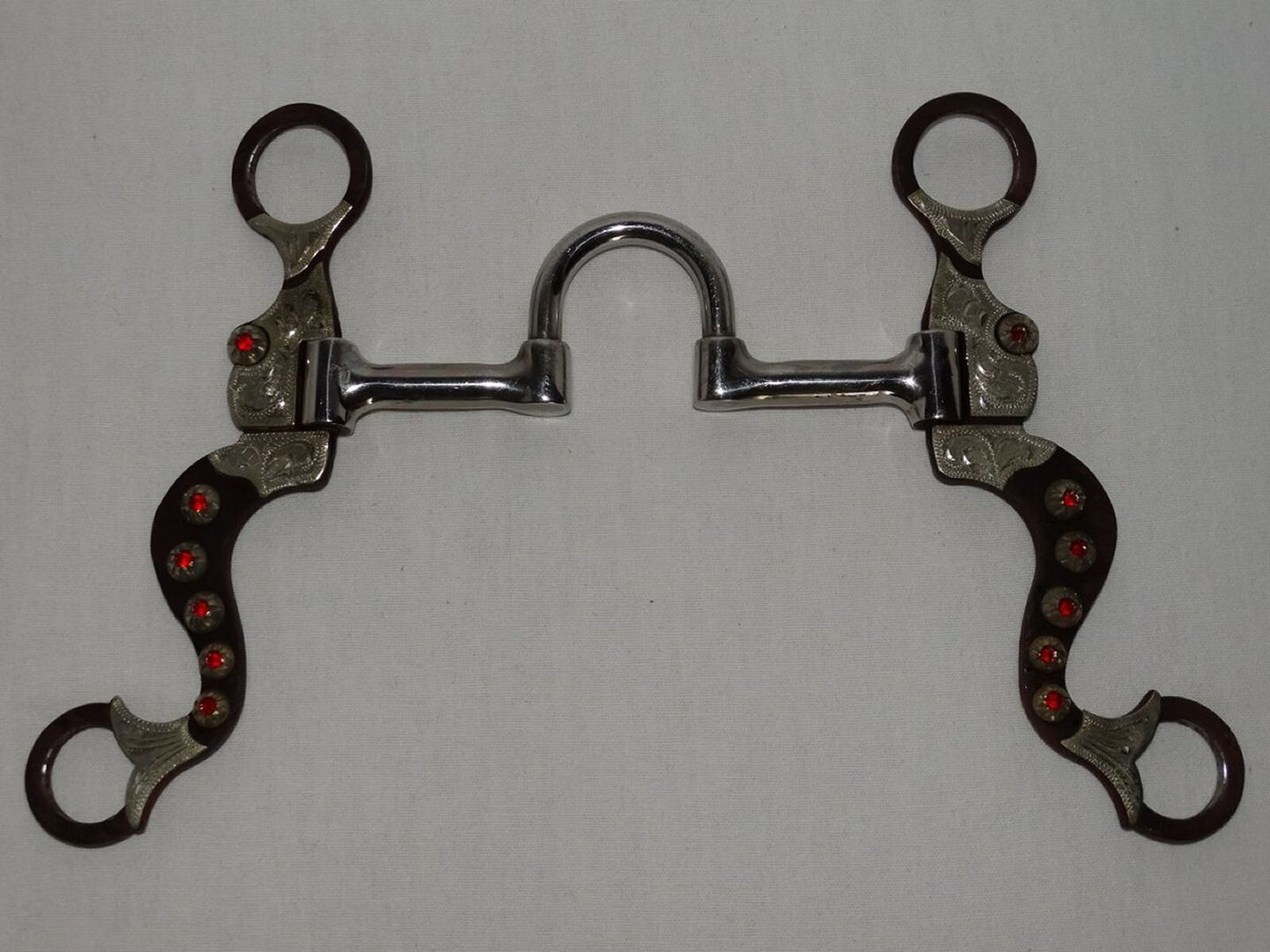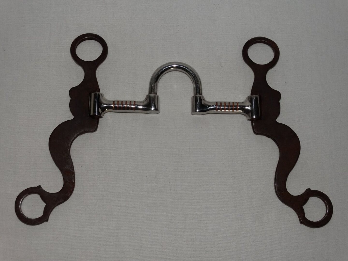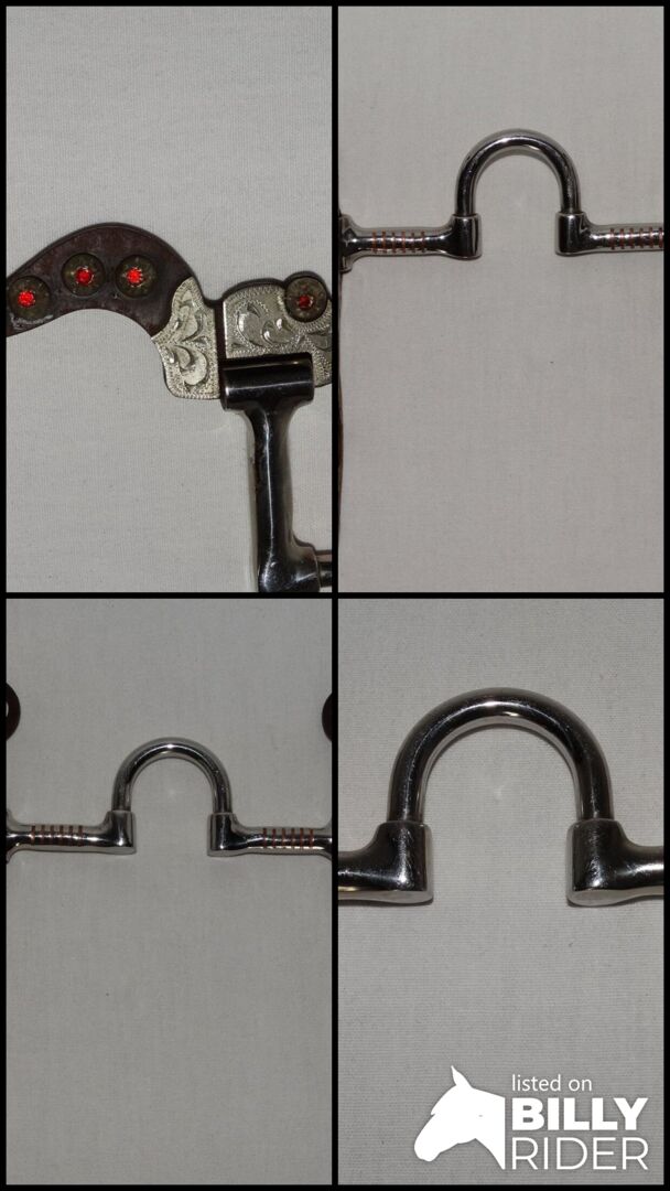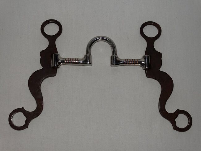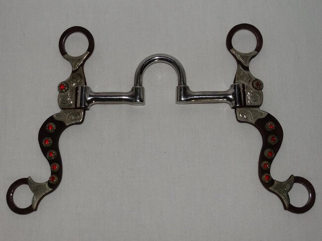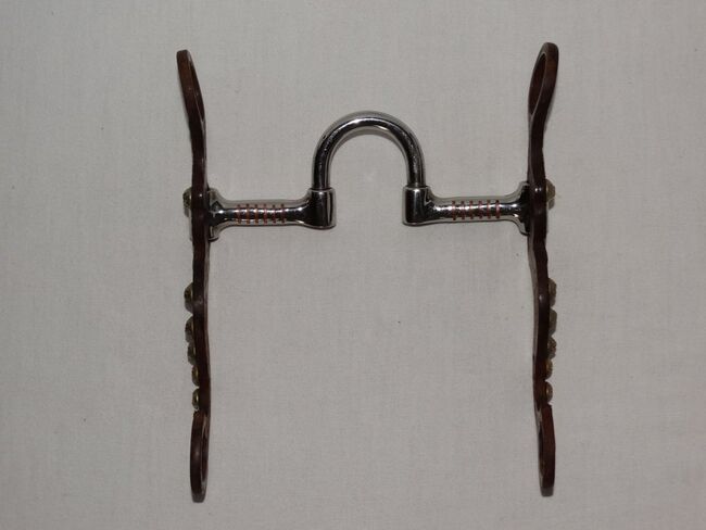 Correction Bit Short Shanks 5" 12,7 cm Western Bit Stainless Steel Sweet Iron - Mint Correction Bit with Short Shanks for sale. Size 5"/12.7 cm. Stainless steel mouthpiece with copper inlays. Short brown sweet iron shanks, total length only approx. 16 cm. Engraved inlays and red rhinestones. It was only used once briefly during a course. Please refer to the pictures for condition, thank you!