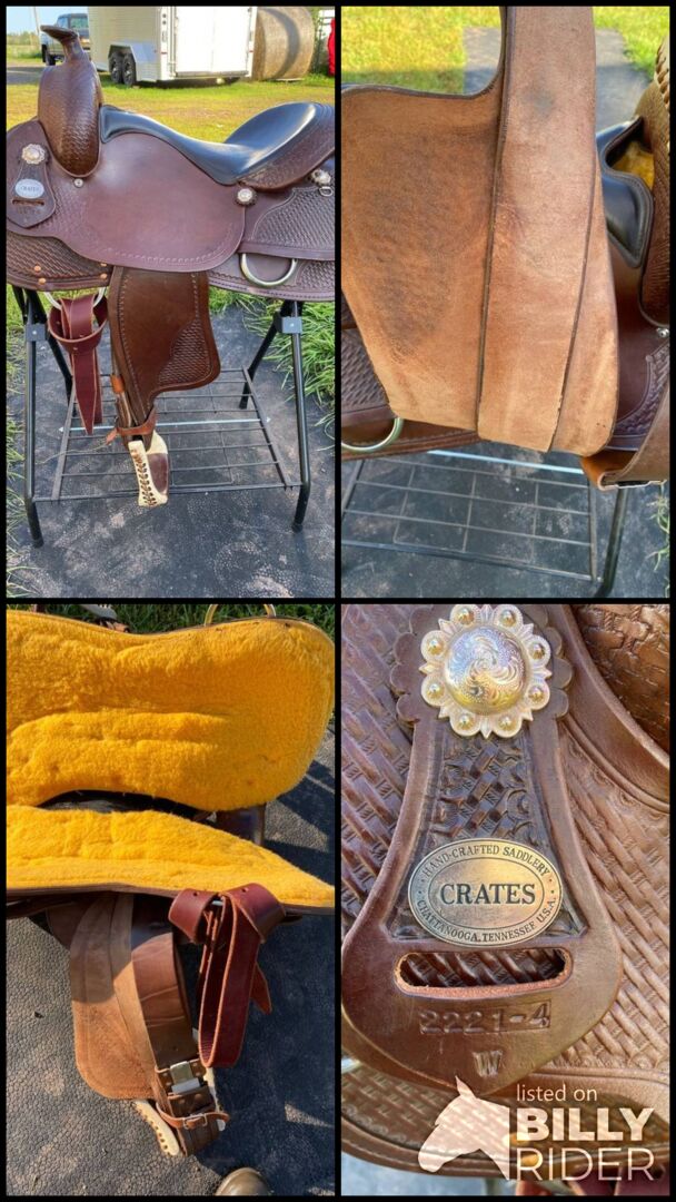 Near new wide tree Crates reining saddle. Excellent condition, about 6-7 yrs old, stored indoors, cared for regularly, nice padded comfy seat. Unfortunately it doesn’t fit my quarter horse. I purchased it new.