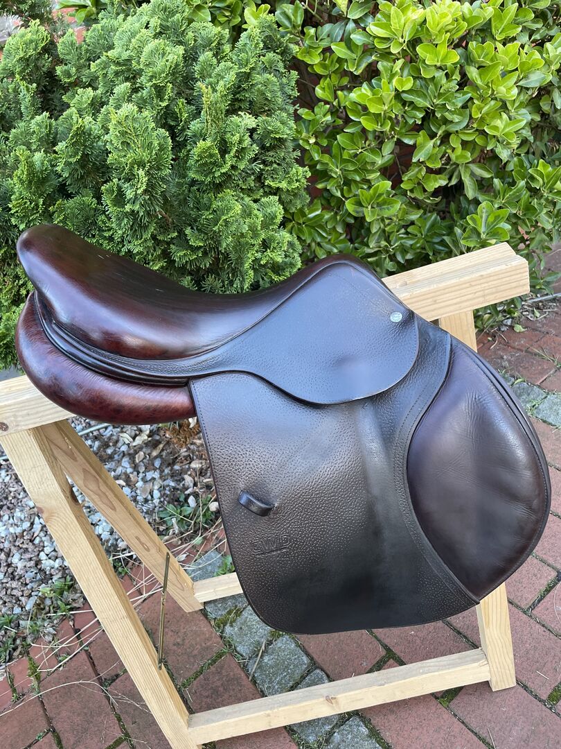 CWD Saddle S02 - We are selling this great jumping saddle from the CWD brand as it unfortunately does not fit our pony. It has a seat size 17 and the chamber width should correspond to a 32 for Prestige. The condition is used, but basically good. As you can see in the photos, the panels are a little stained.