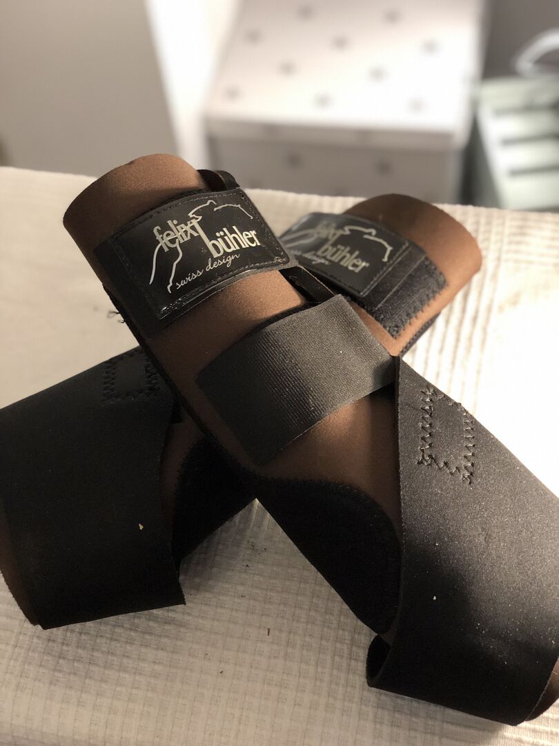 Dressage gaiters (front) - Especially protective dressage boots made of chloroprene rubber from Felix Bühler (Krämer) for the front legs in the colour "dark brown". Only 2x used, are unfortunately too big for my horse. Very good condition (NP 32€).