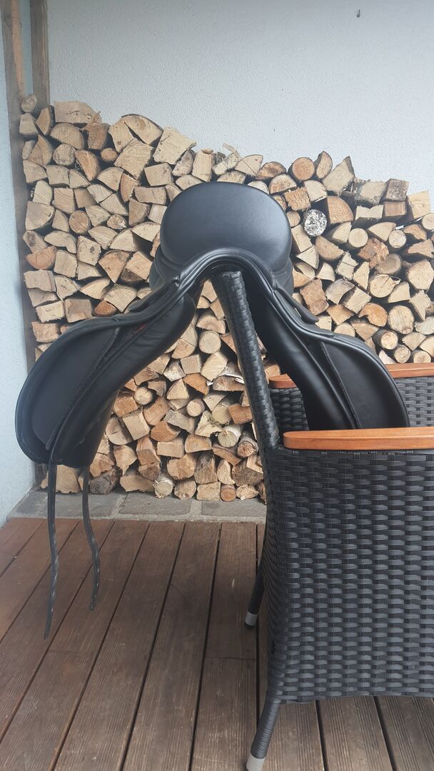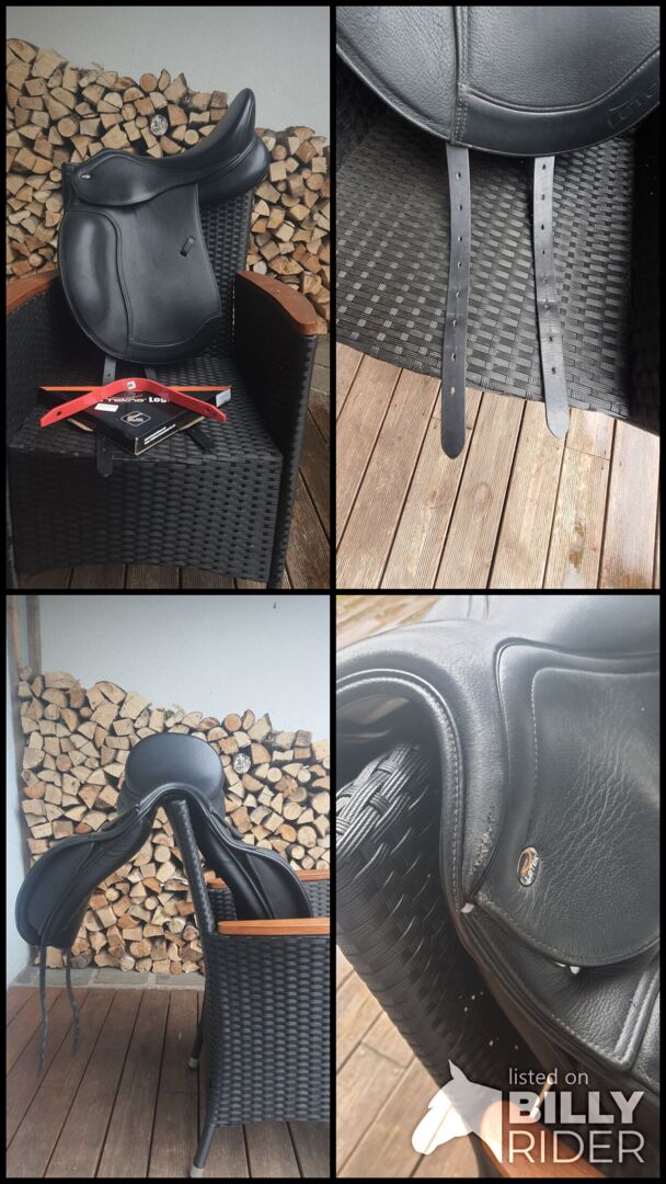 - Seat size 17,5 - Length approx. 44cm - New purchase February 2022 - new price 1300€ - with exchangeable gullet plate (cold adjustable by saddler) - with girth strap - with velcro pommels - gullet plate W - 33/34 chamber width (exchangeable) - french panels (pad bar) - wide vertebral canal On a place at the gullet plate it is unfortunately somewhat roughened. But does not bother and does not tear further. (See picture) - surface is made of soft leather