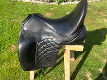 Dressage saddle company Dresch - Black dressage saddle made by Dresch, chamber width 32" adjustable, very comfortable, standard flap with under flap on Velcro (SUP) Leaf leather: doubled black quilted Fore flaps: Patent leather in black Piping: patent leather in black Batten: double batten, inside patent leather in black, outside starry sky made of Swarovski stones, Seat leather: cowhide in black Knee support: pre-shaped Small pockets: Buffalo leather in black