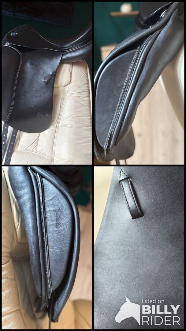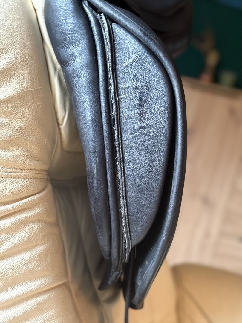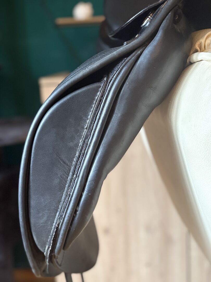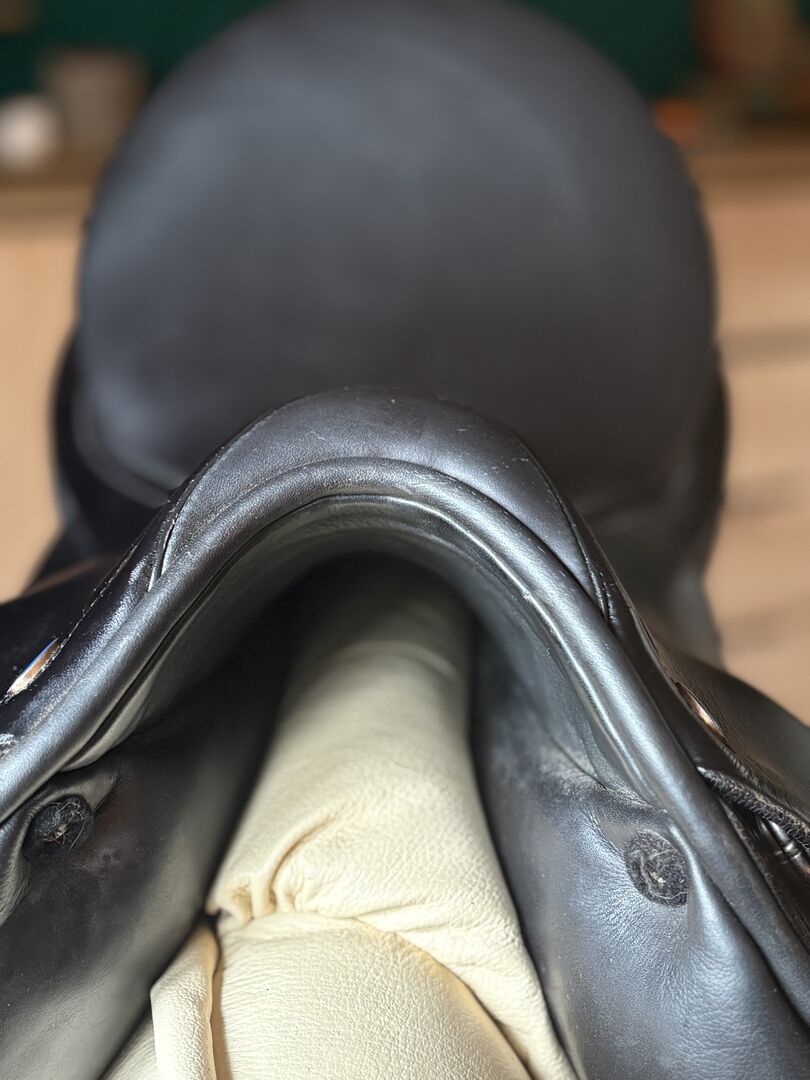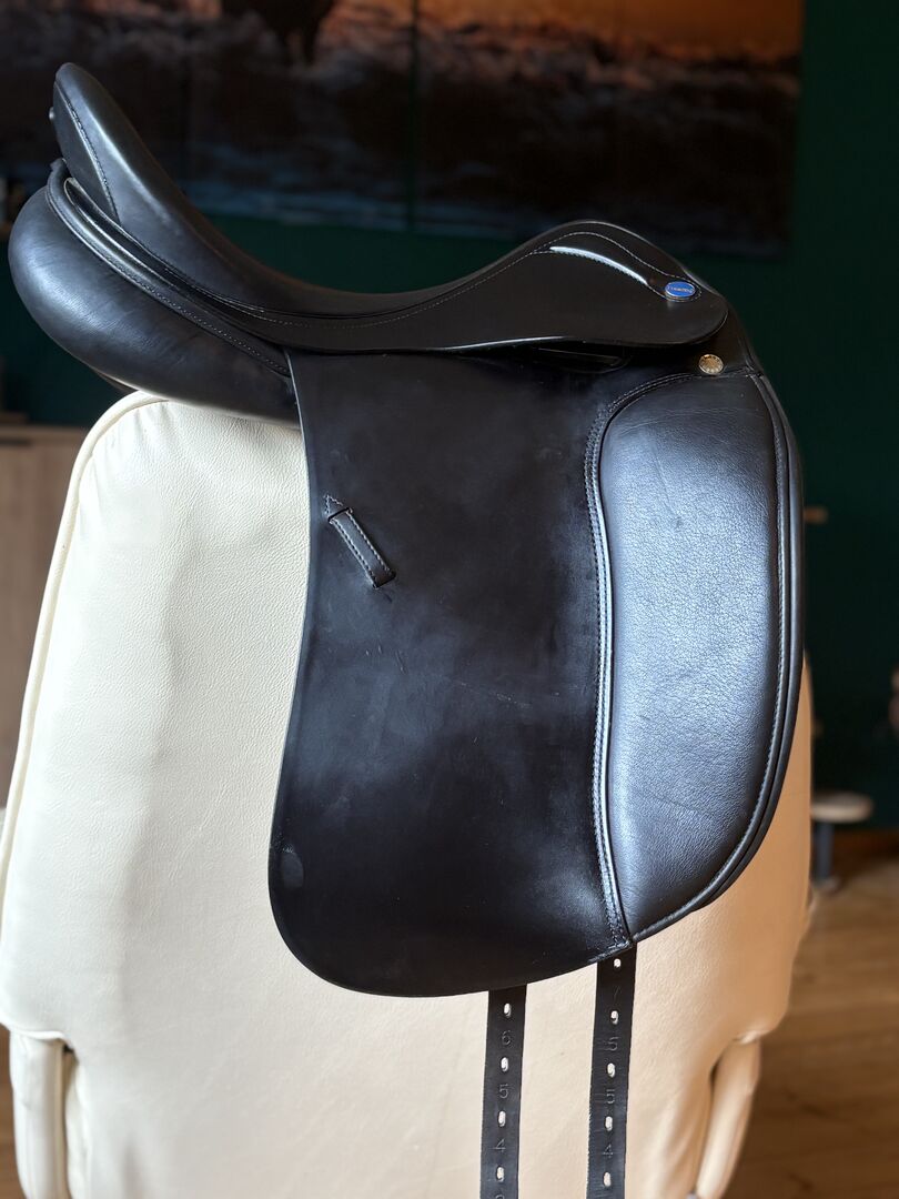 The saddle offers a comfortable and secure seat for dressage work. The leather shows minimal signs of use, but is in good overall condition. The padding has been checked regularly and is in good condition. The saddle tree is made of synthetic material, which makes the saddle individually adjustable and lightweight.
