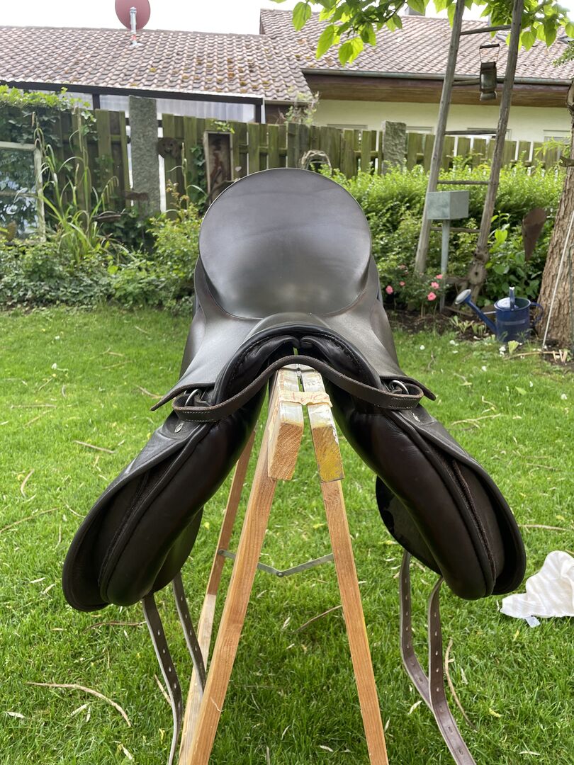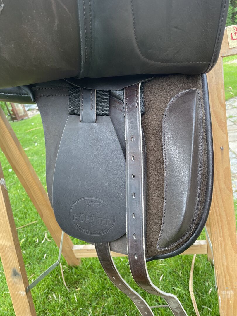 Dressage saddle I Brown I Seat size: 17.5 inches I Short flap I Velcro blocks - A new dressage saddle from the Höpfner brand is for sale. It is the special model Ahlerich Edition Ingrid Klimke with original English feather tree. Features: - Leather panels with wedges - Color: Brown, smooth leather - Seat size: 17.5 inch - Chamber width: 32 cm Special feature: The saddle has interchangeable Velcro panels - one pair for less support and another for more support, depending on the rider's preference. The saddle is unused and in mint condition. Private sale, therefore no guarantee or returns.