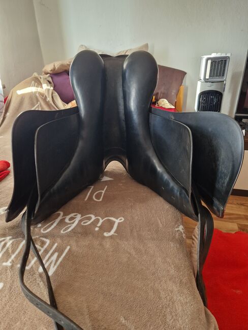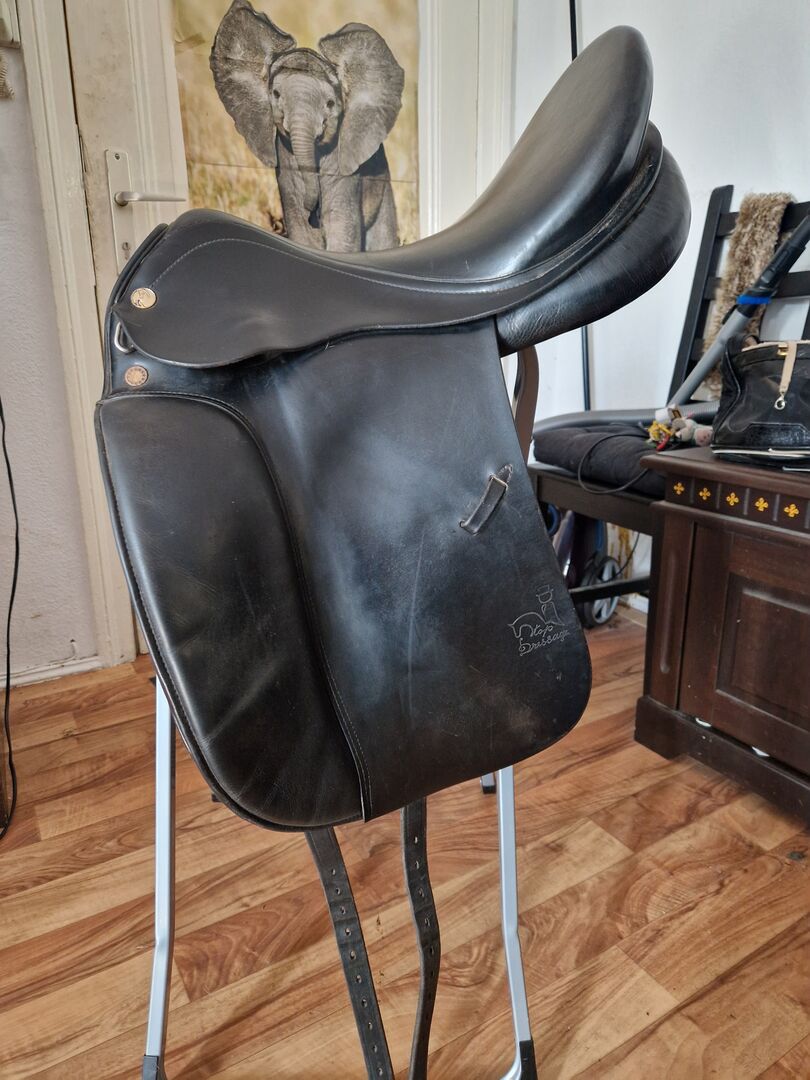 Dressage saddle Prestige Top Dressage KW 34 - URGENT!!! I am selling my very well-maintained Prestige dressage saddle, model 'Top Dressage'. It has just been checked by the saddler and is in good condition, but unfortunately no longer fits my mare. The saddle is super comfortable and feels great to sit on. The gullet width is 34, but this can also be adjusted by the saddler. The saddle was on a slim Oldenburg mare. Seat size: 17 inches. If you are interested, I can also supply a black lambskin pad from Harry's Horse and a saddle cover from Prestige for 40 euros. The pad is one year old and still nice and soft.