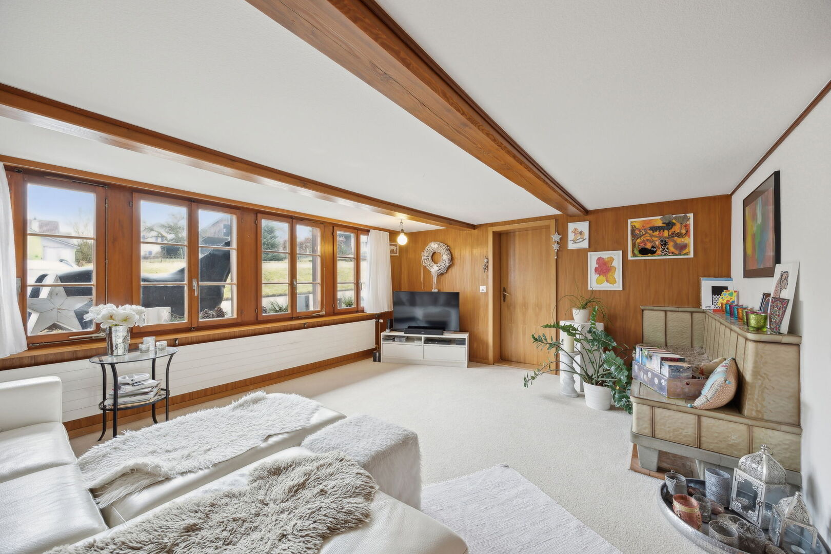 The 6.5-room residential unit has an area of 147 m² and is in a well-kept condition. The apartment extends over two floors. On the ground floor there is a living room with a tiled stove, a bathroom and two further rooms. The large dining area with open kitchen offers plenty of space and a direct view of the horses. There is also a further room with a washing machine and tumble dryer.
