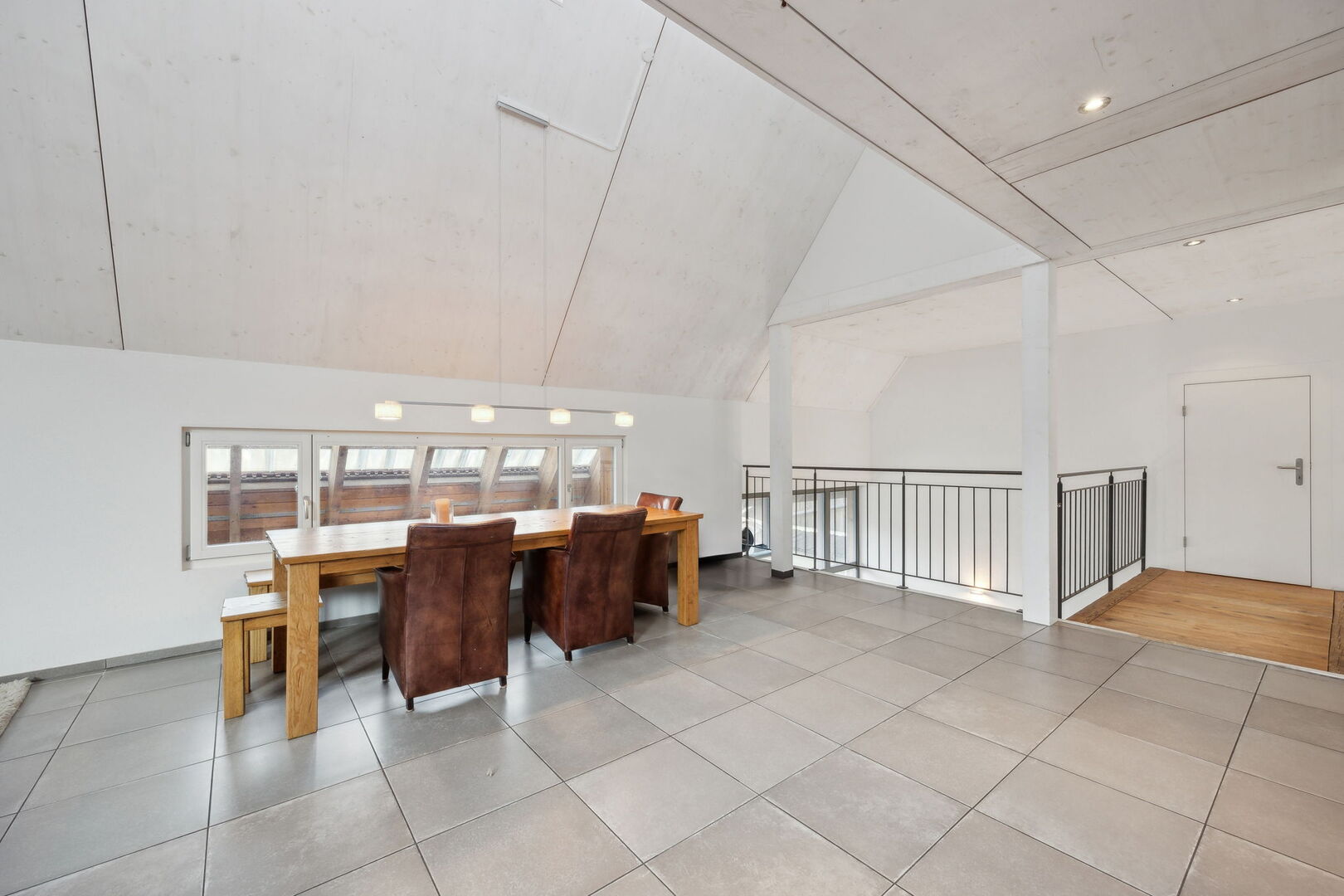 Inside the completely renovated 4.5-room unit with a total of 209 m², a spacious entrance area awaits you. From there you have direct access to the adjoining rooms. An elegant steel staircase leads to the gallery-like upper floor, which houses the living and dining area as well as the open kitchen. This floor is complemented by a utility room and a separate guest toilet behind the kitchen front.