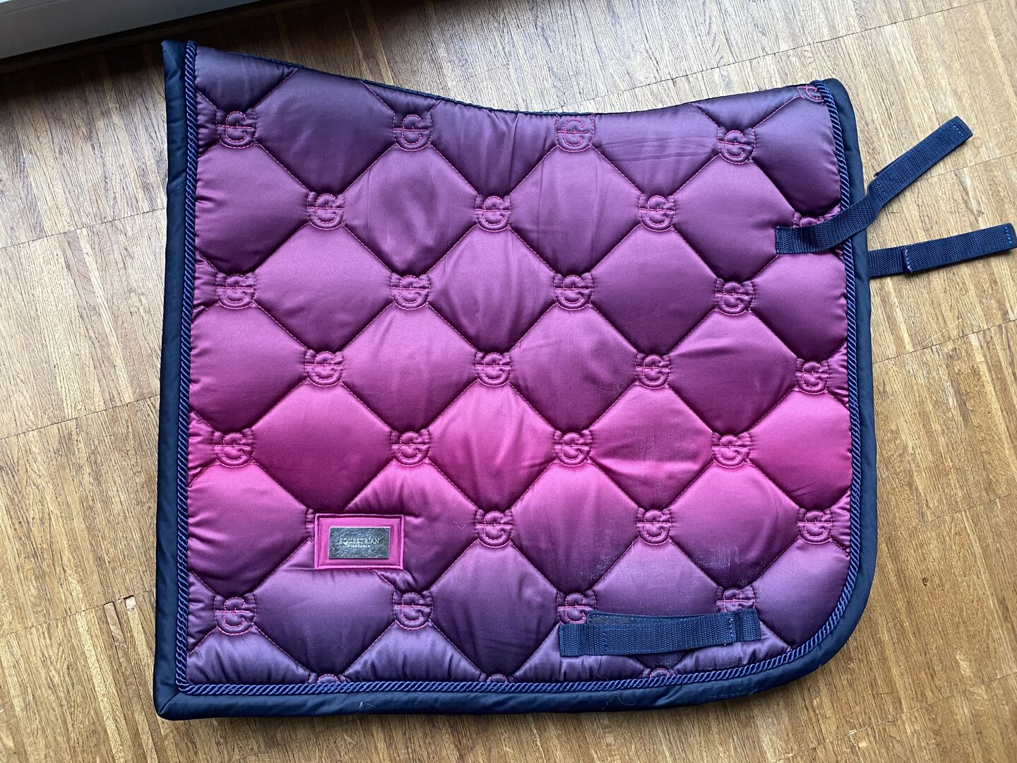 I am offering a set of dressage saddle pad and bandages. Slight signs of wear on the left side, but not noticeable on the horse. The girth area is in top condition. The bandages have been slightly shortened but still fit a warmblood.